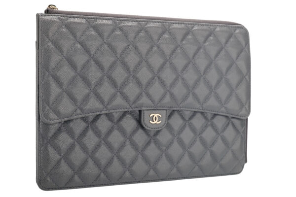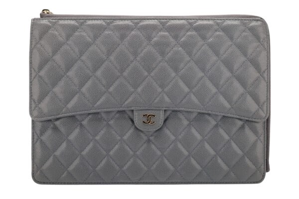 £2,999.00Chanel Lambskin Chevron Medallion Grey Clutch, Gold HardwareJanuary 9, 2026 -