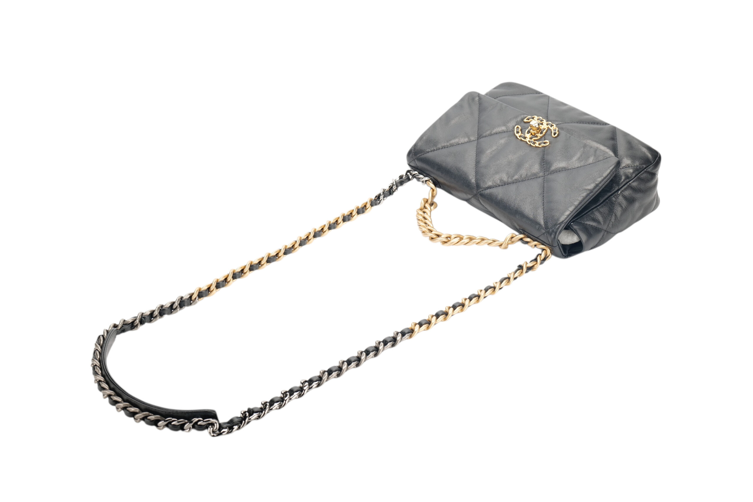 For timeless Parisian-chic there is no better investment than a Chanel flap bag. This Chanel 19 Flap Bag is in black lambskin with mixed metal hardware and has the signature diamond quilting, signature CC interlocking closure, exterior back slip pocket, chain top handle, and long mixed metal and black leather chain. This interwoven chain sits elegantly on your shoulder or doubled up on your arm.