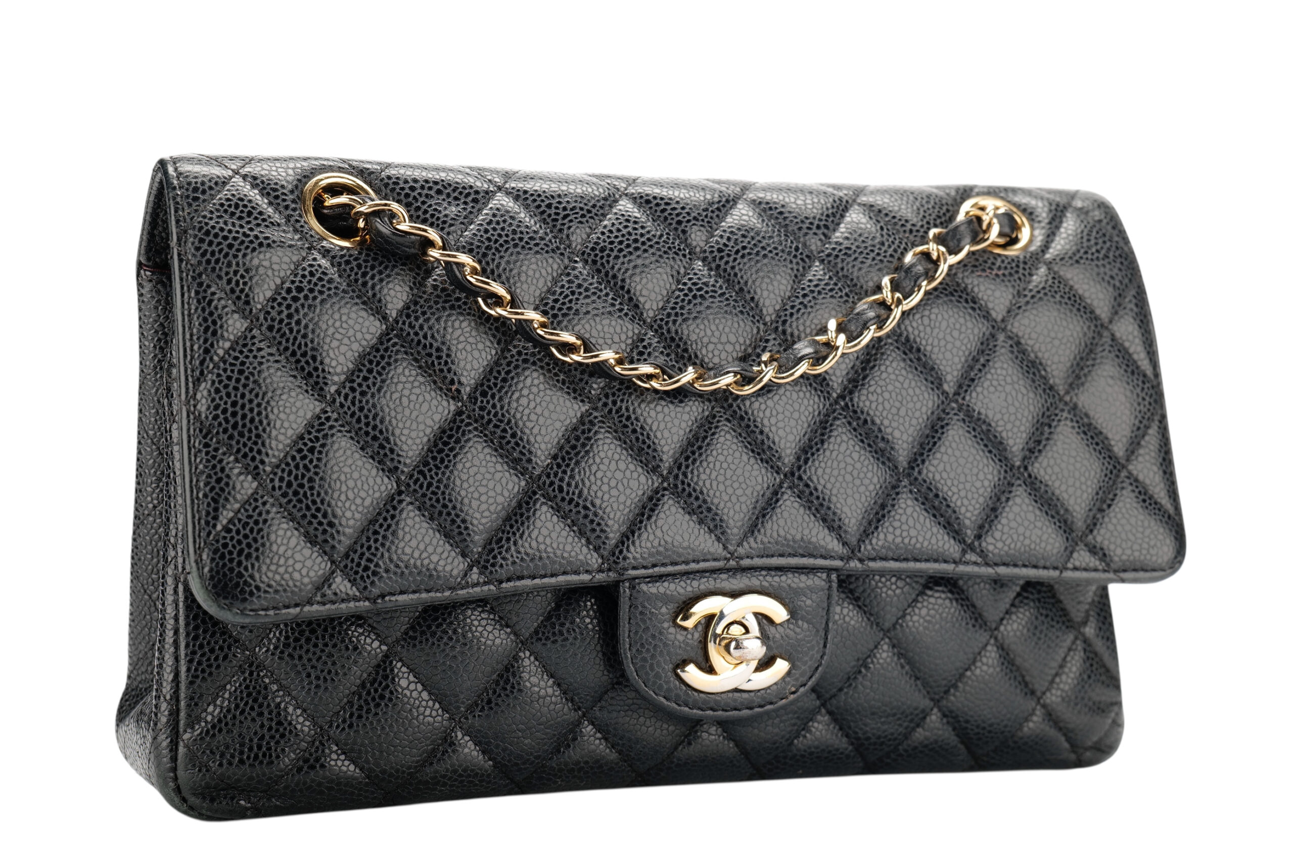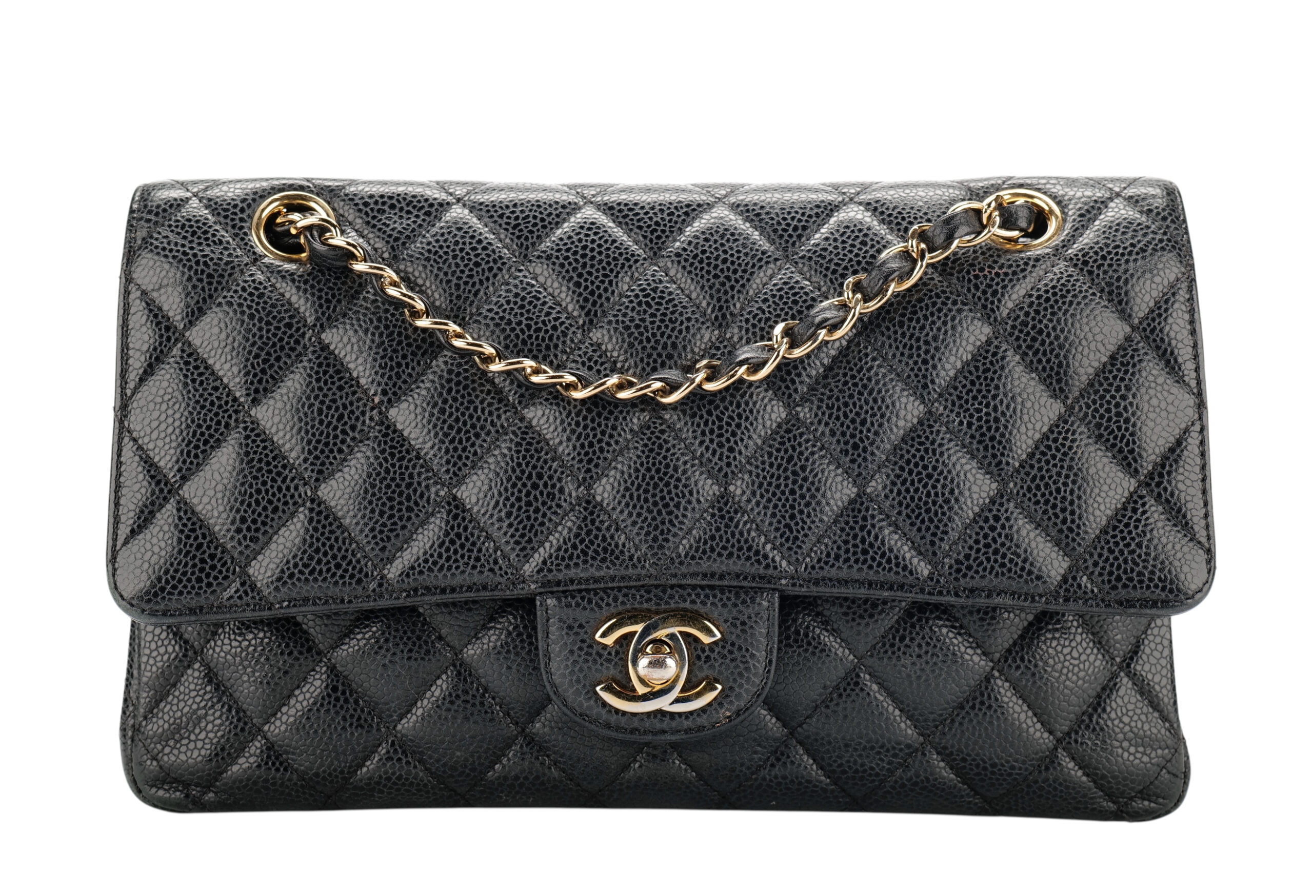 A timeless icon, reimagined in its most coveted form. This Chanel Medium Classic Double Flap bag is crafted from luxuriously durable black caviar leather, known for its signature pebbled texture and resistance to wear
