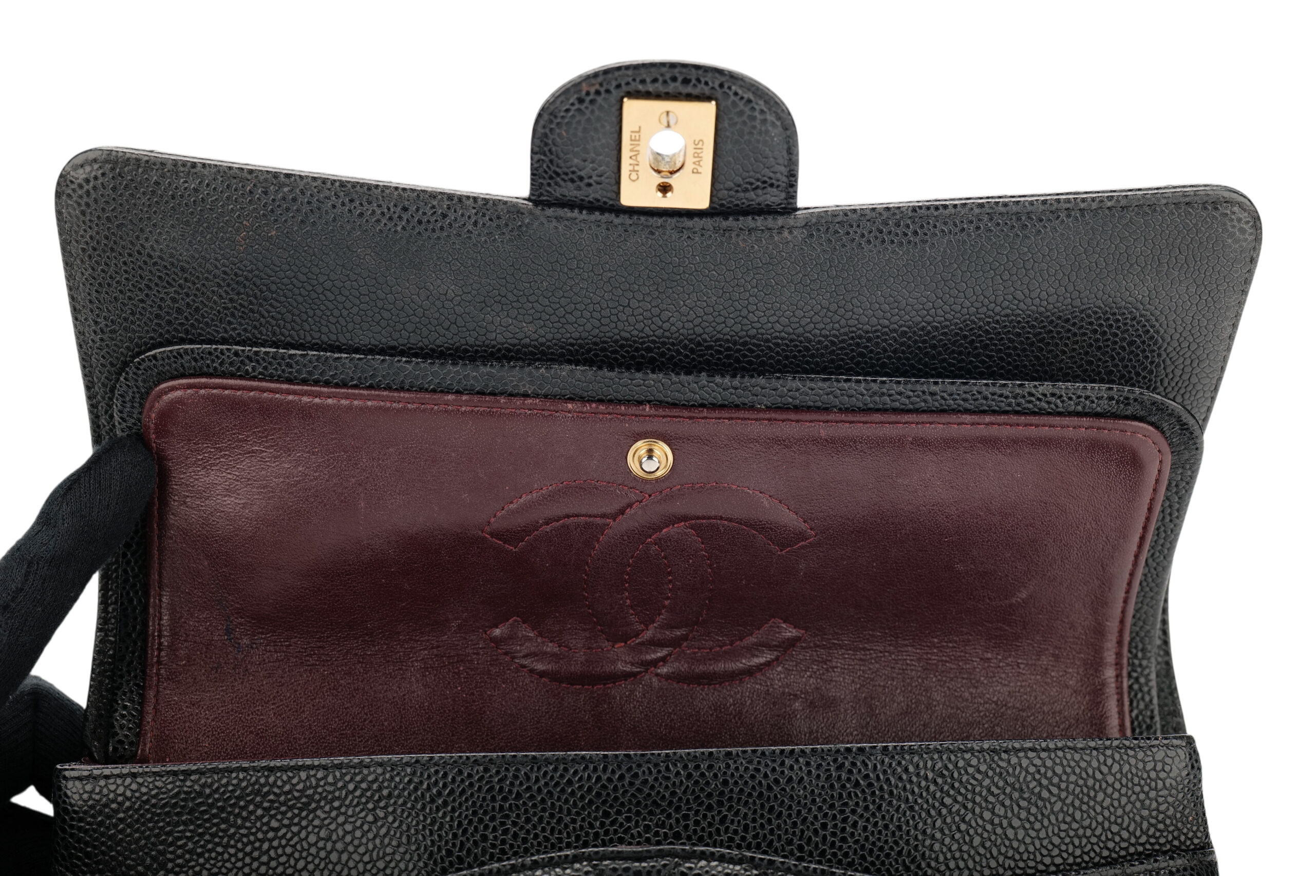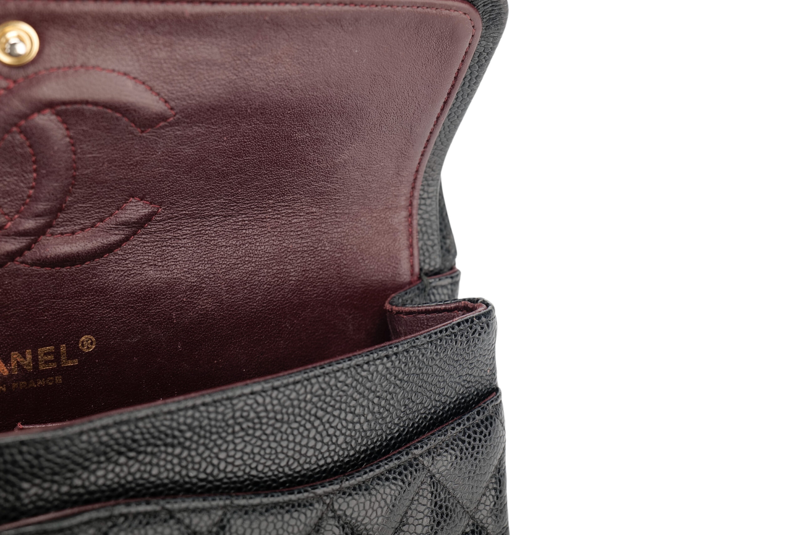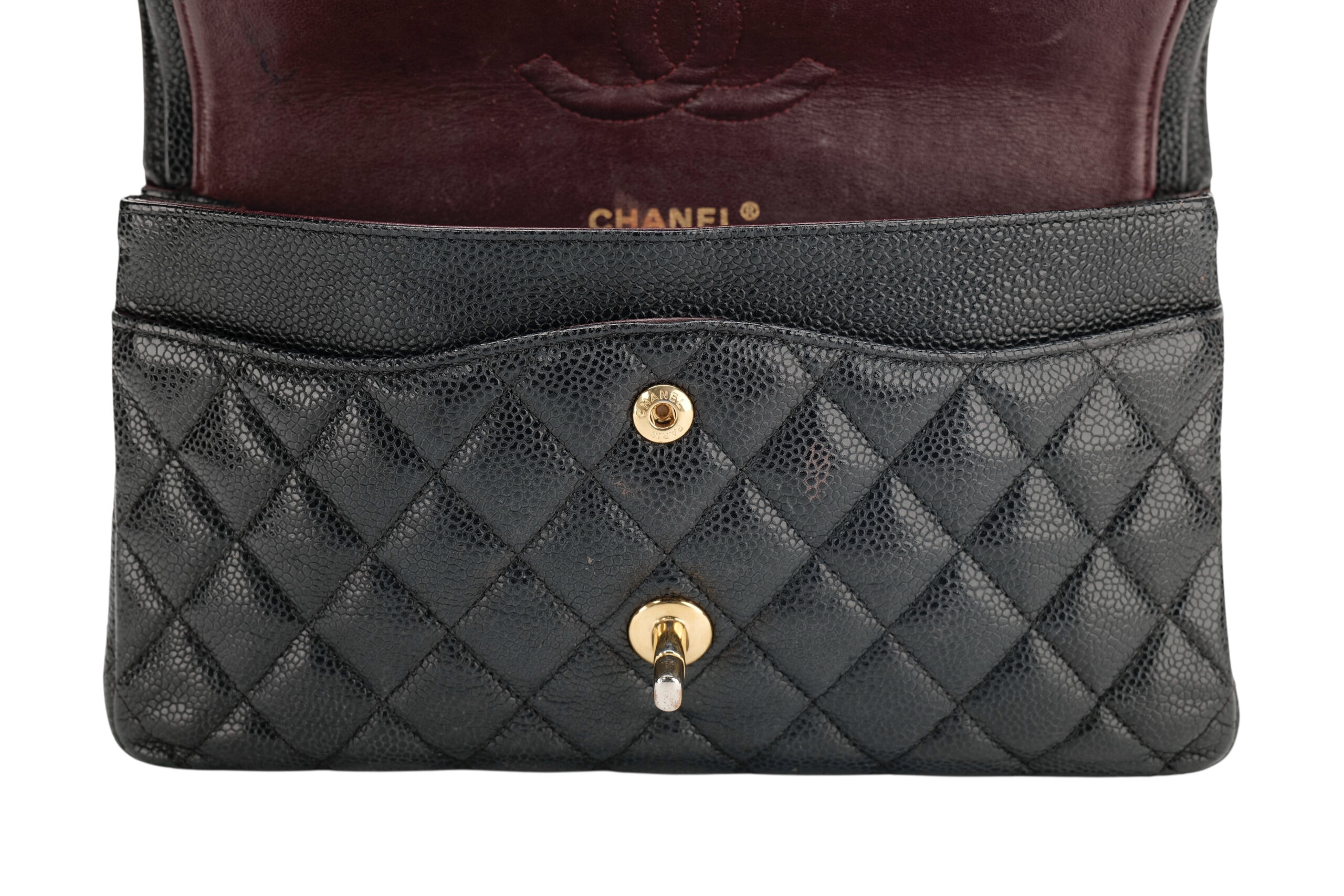 This exquisite handbag showcases the legendary CC turn-lock closure, signature diamond quilting, and double flap interior, all meticulously designed to preserve structure and elegance over time. Inside, you’ll find the classic burgundy leather lining — a nod to Coco Chanel’s love of hidden beauty — along with multiple compartments for refined functionality