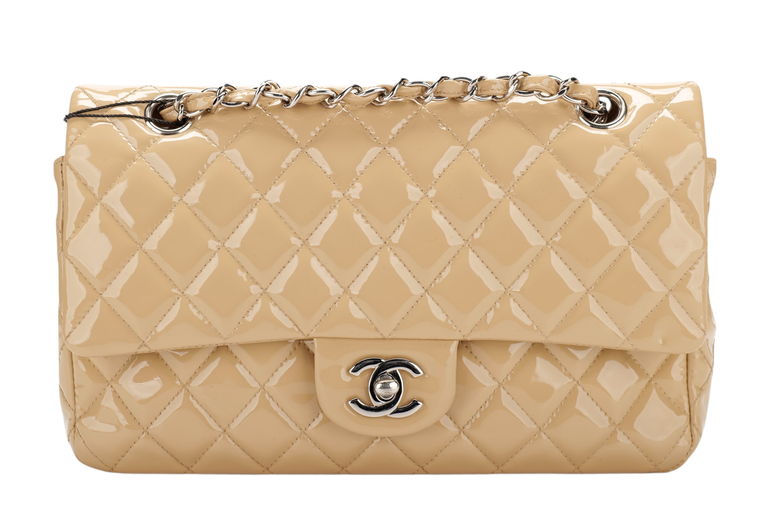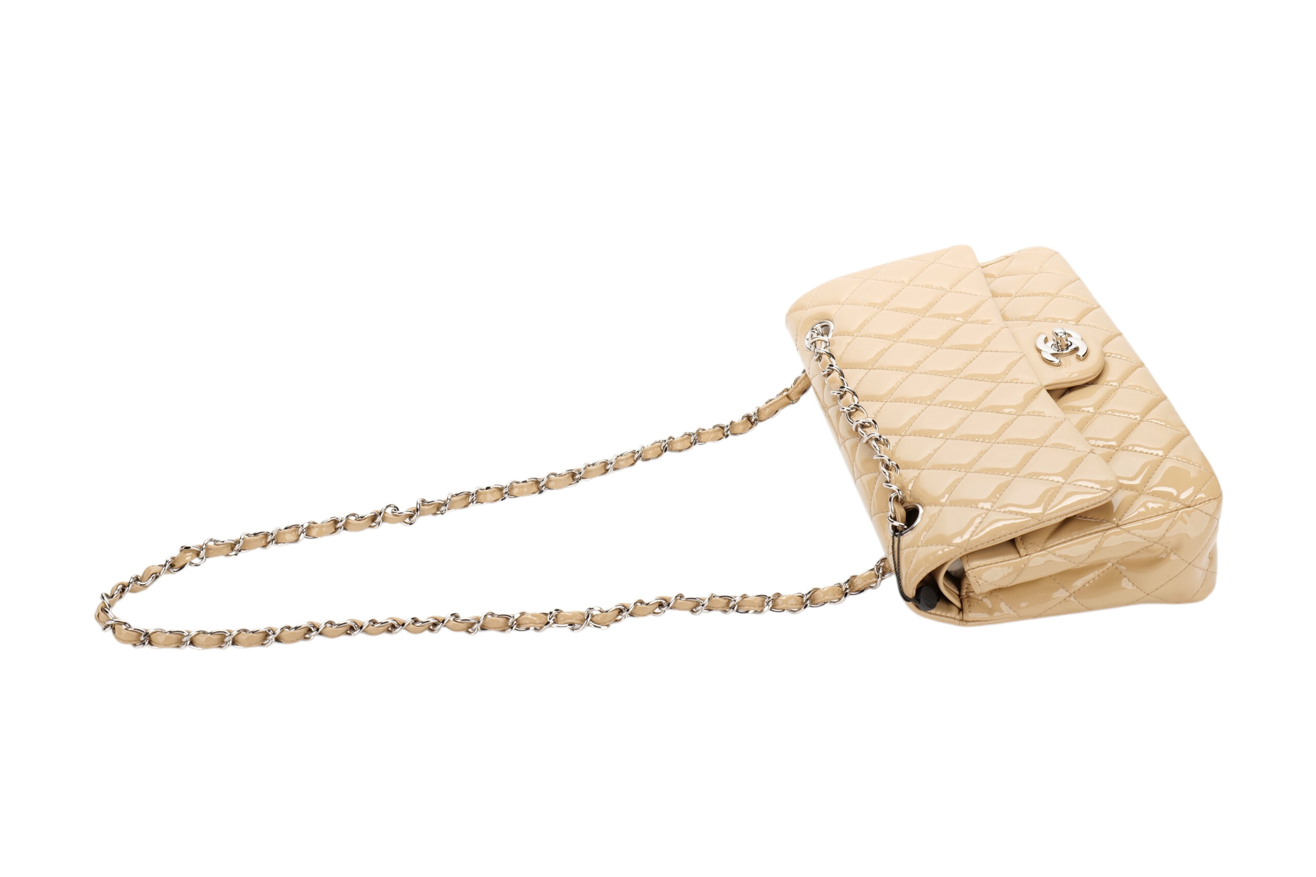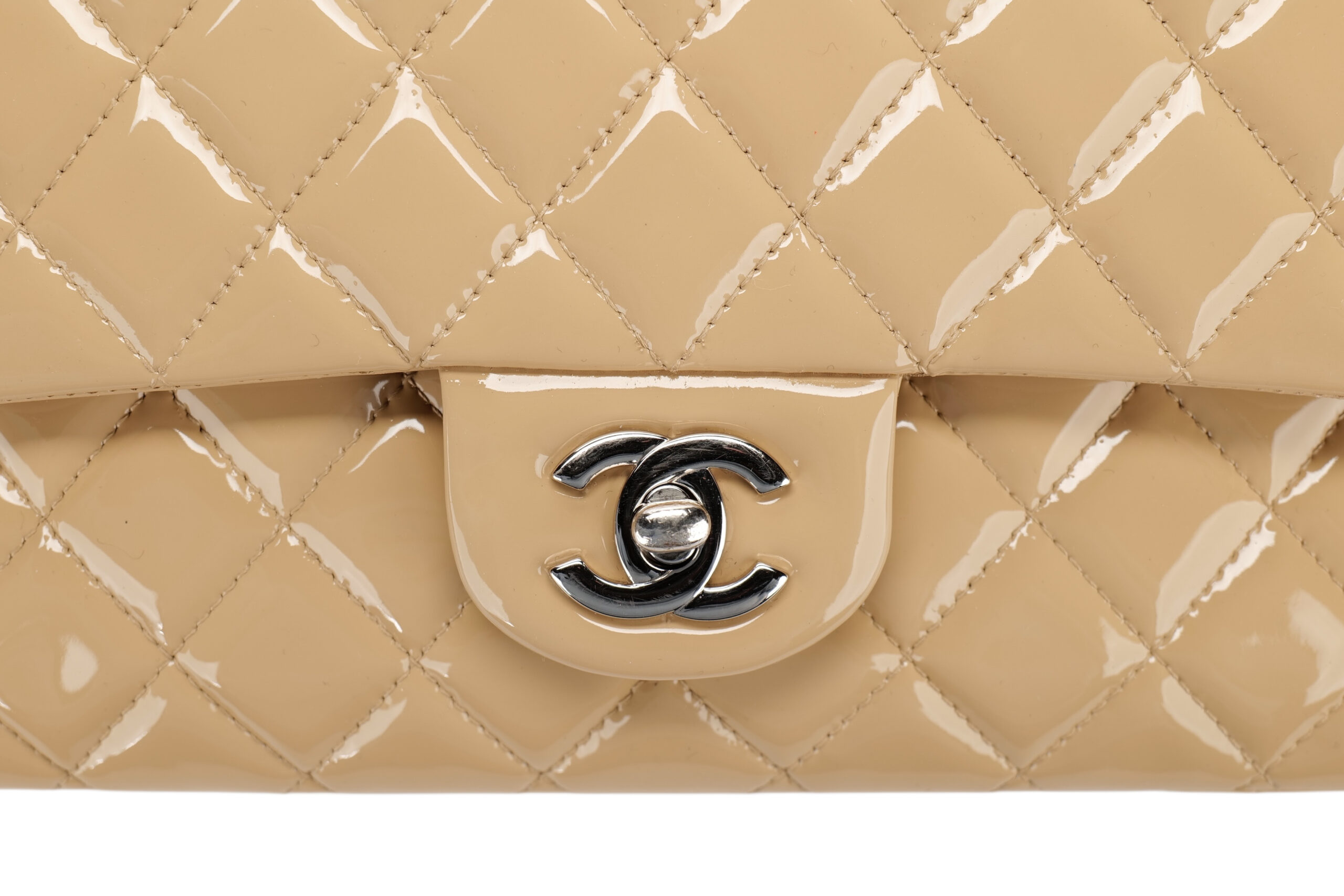 A timeless icon, reimagined in its most coveted form. This Chanel Medium Classic Double Flap bag is crafted from a luxurious beige patent leather, known for its signature shine a delicacy.