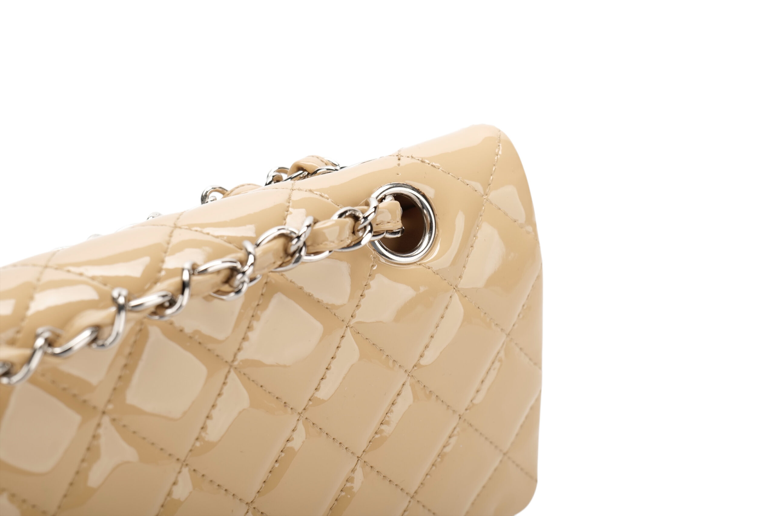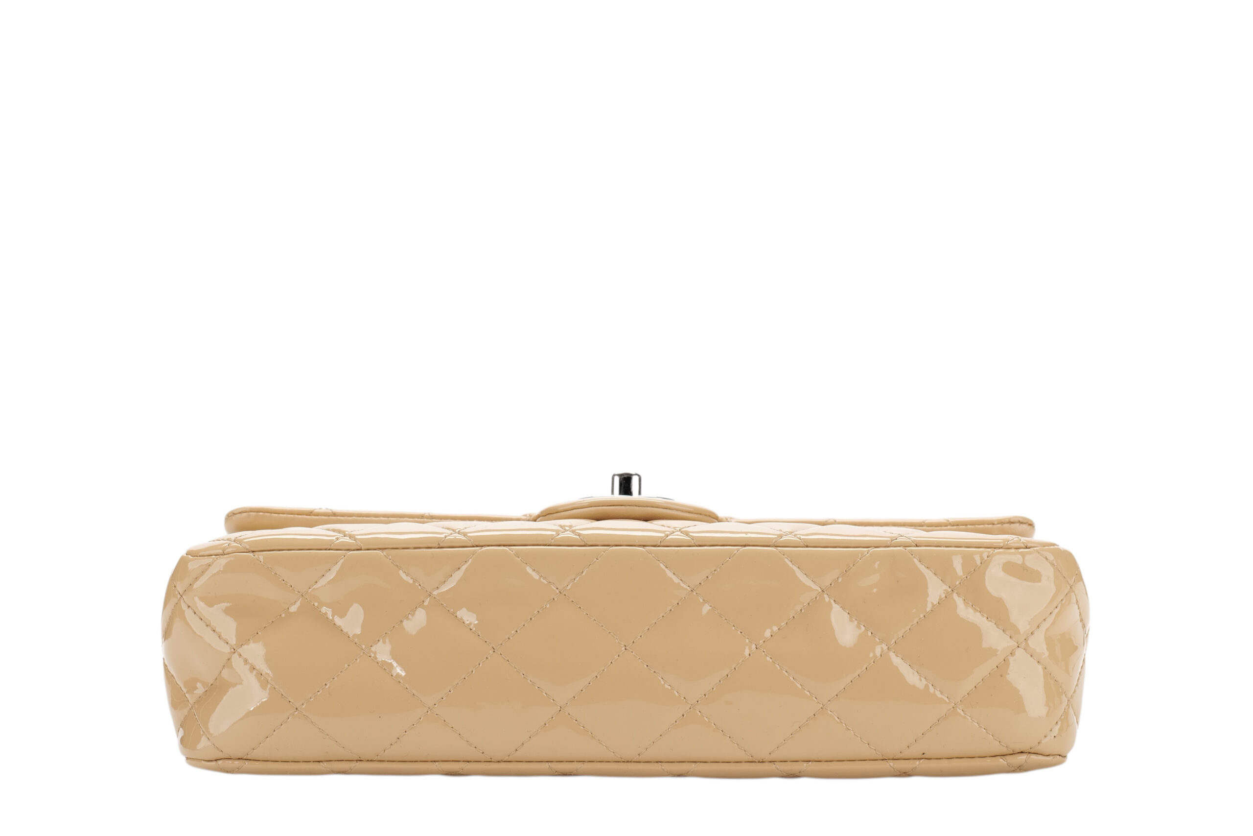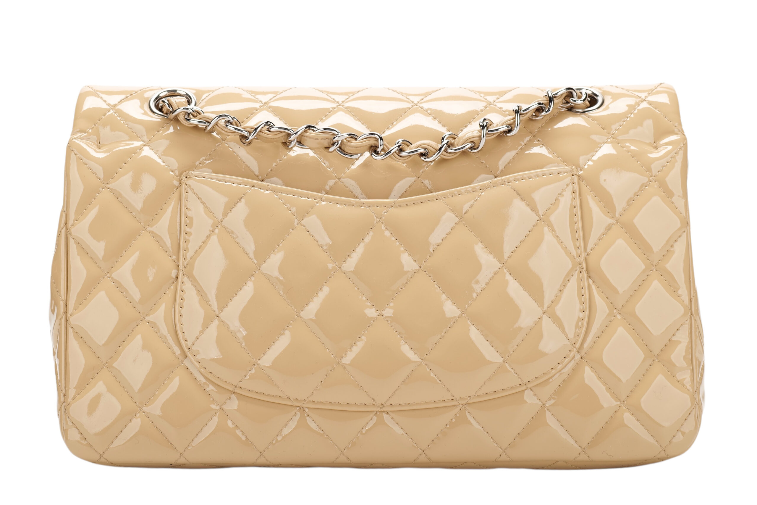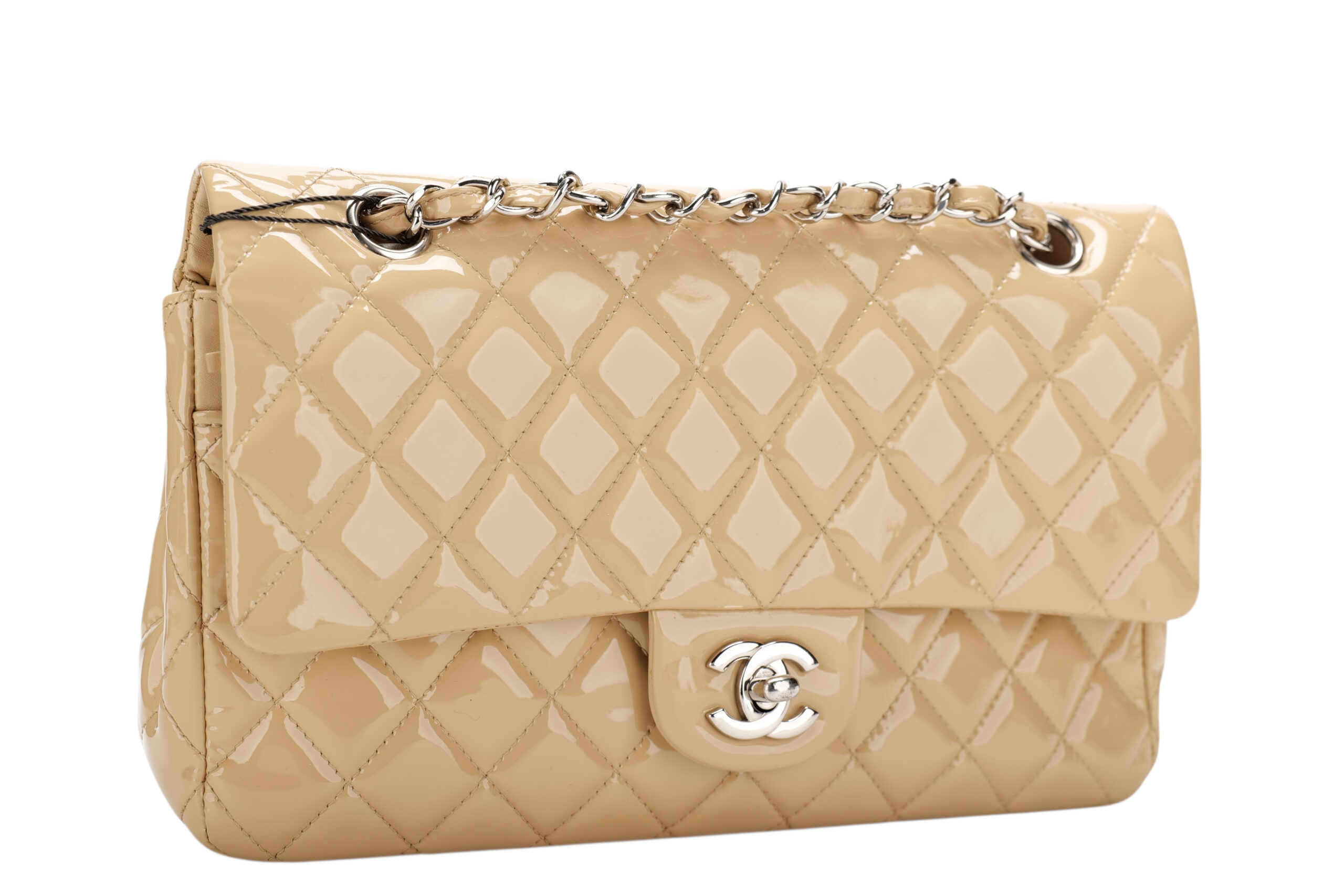 A timeless icon, reimagined in its most coveted form. This Chanel Medium Classic Double Flap bag is crafted from a luxurious beige patent leather, known for its signature shine a delicacy.