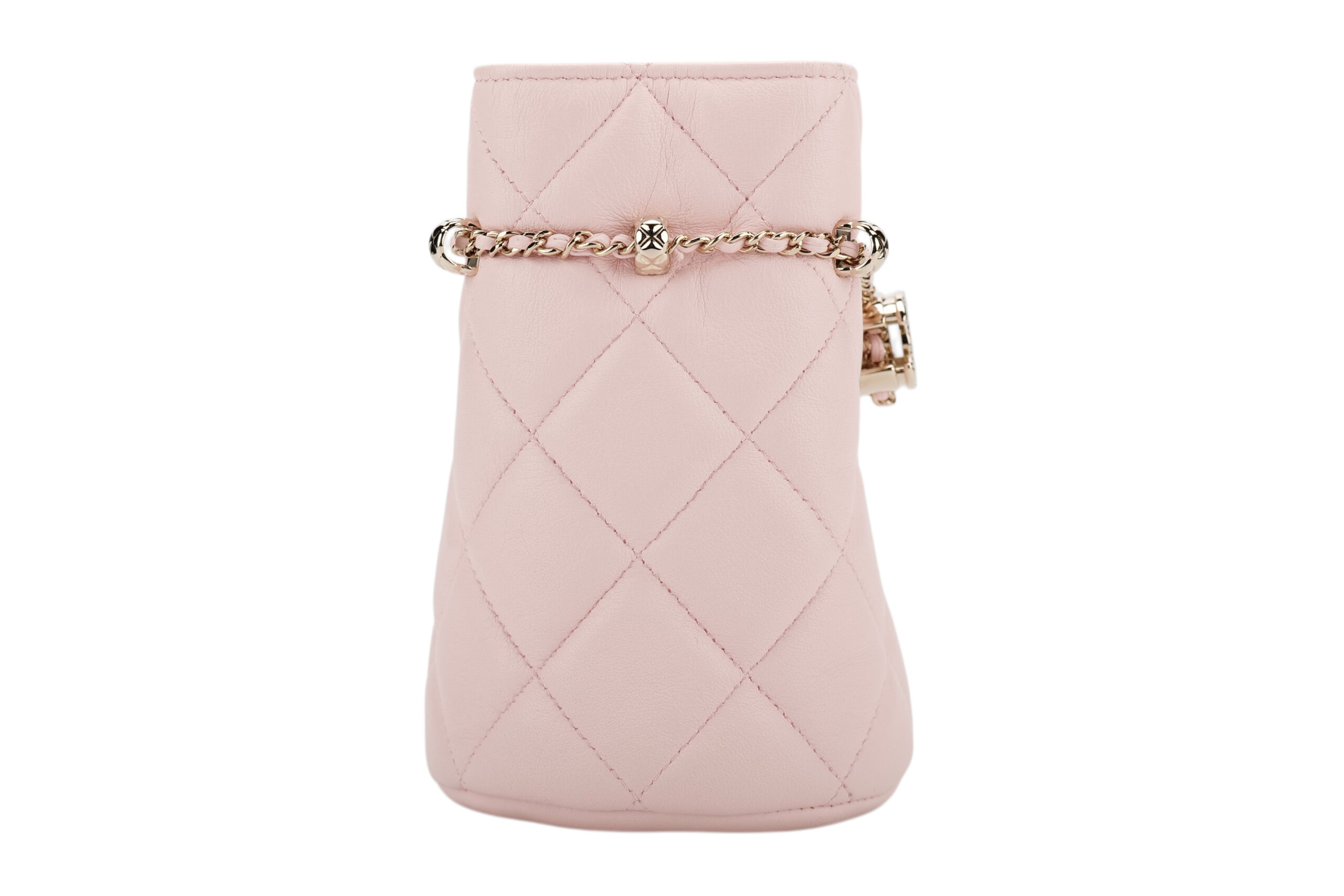The Chanel Pink Quilted Mini Bucket Bag is a delightfully feminine take on the classic bucket silhouette, wrapped in the maison’s signature diamond-quilted lambskin for a soft, luxurious feel. Its delicate blush hue pairs beautifully with the aged gold-tone hardware, adding a vintage-inspired charm that elevates this petite piece from simple accessory to statement collectible. The standout feature is the intricate aged-gold CC charm threaded through the leather-woven chain—an unmistakable nod to Chanel’s heritage of craftsmanship and timeless Parisian elegance.