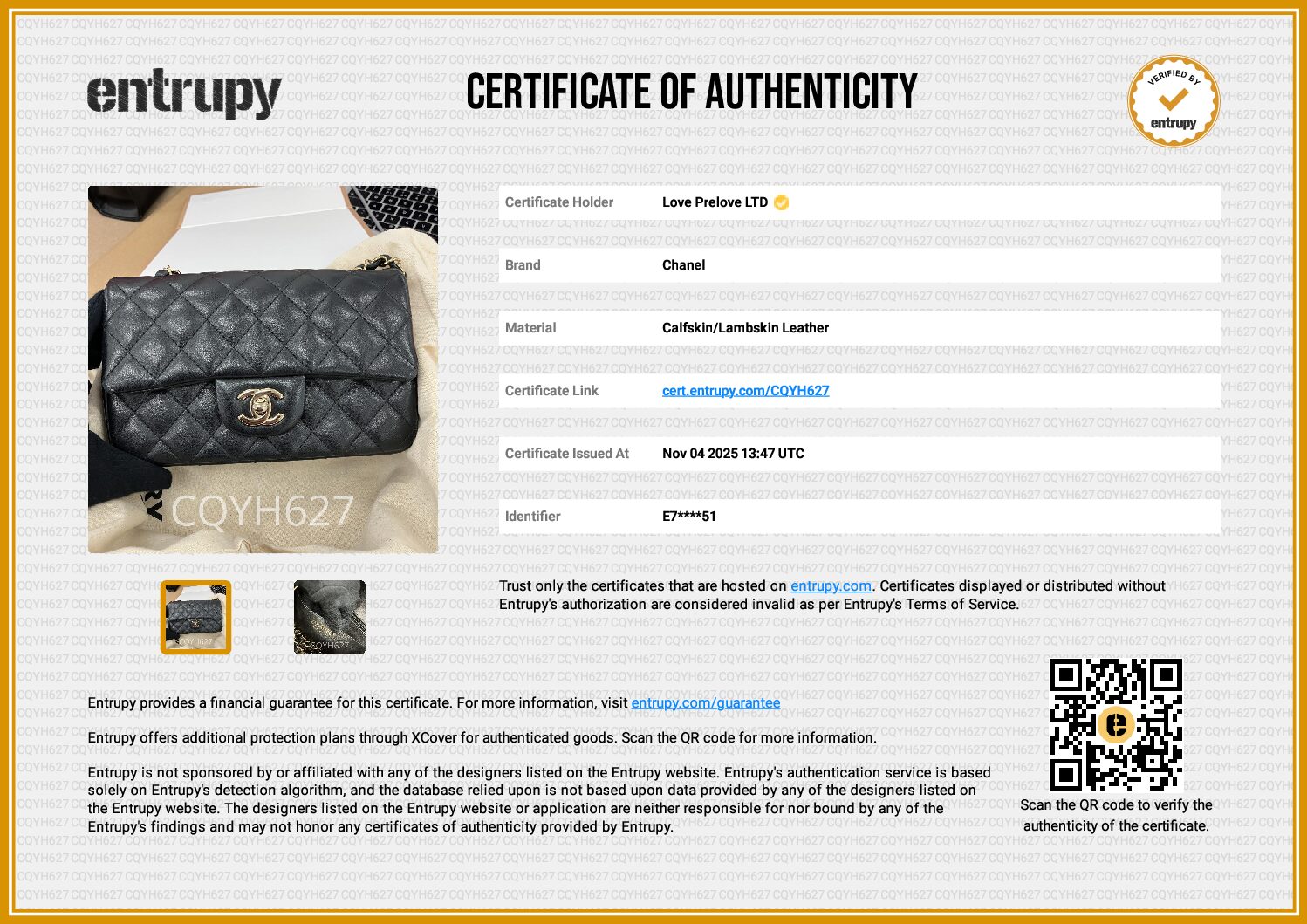 All bags sold via Love Prelove go through rigorous checks to ensure authenticity. All bags are sold with an authentication certificate either from Entrupy or Bababebi.