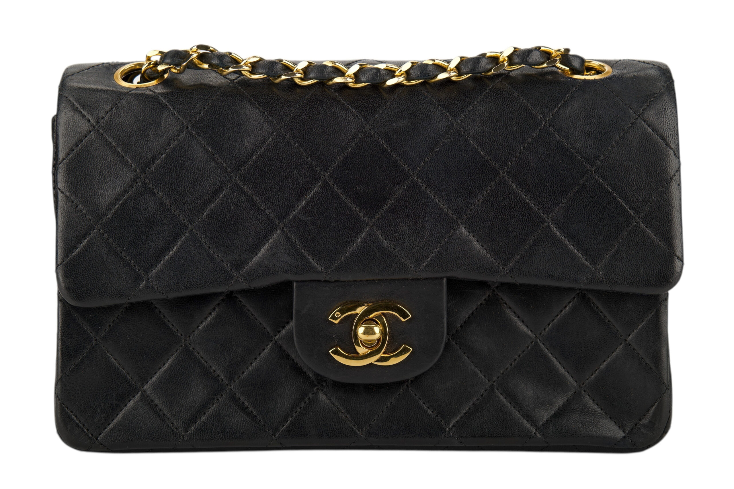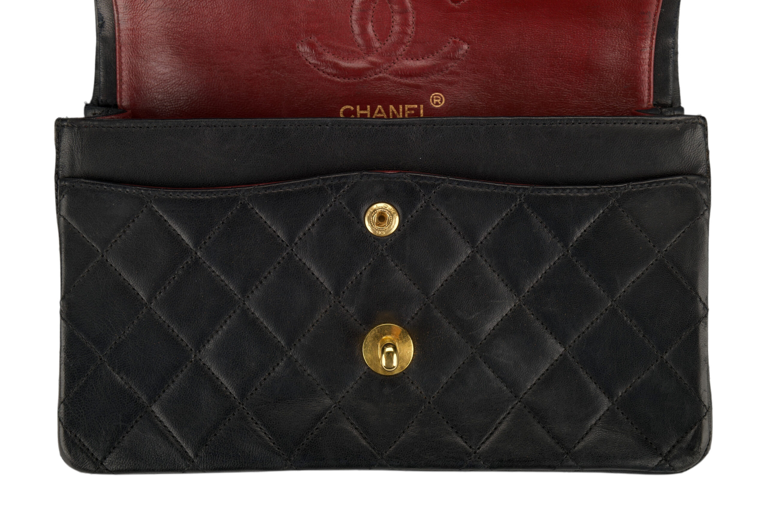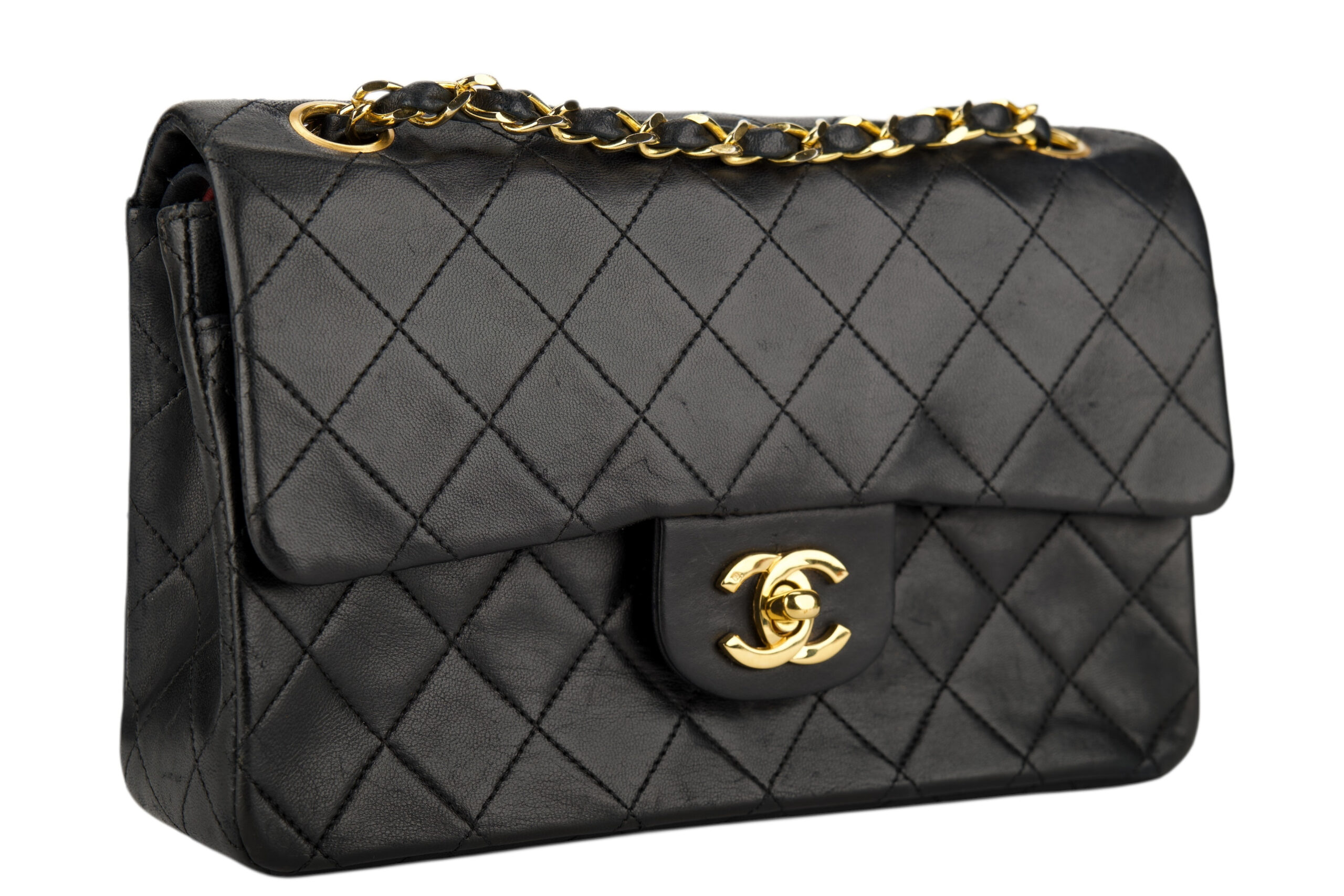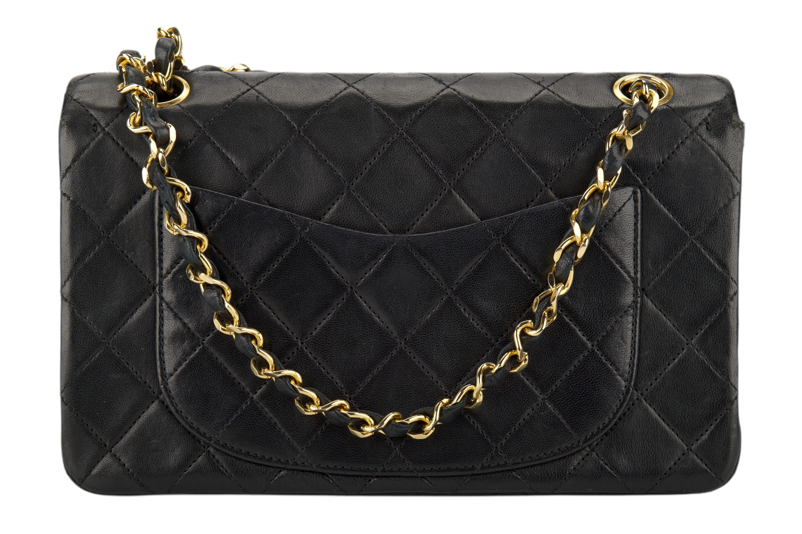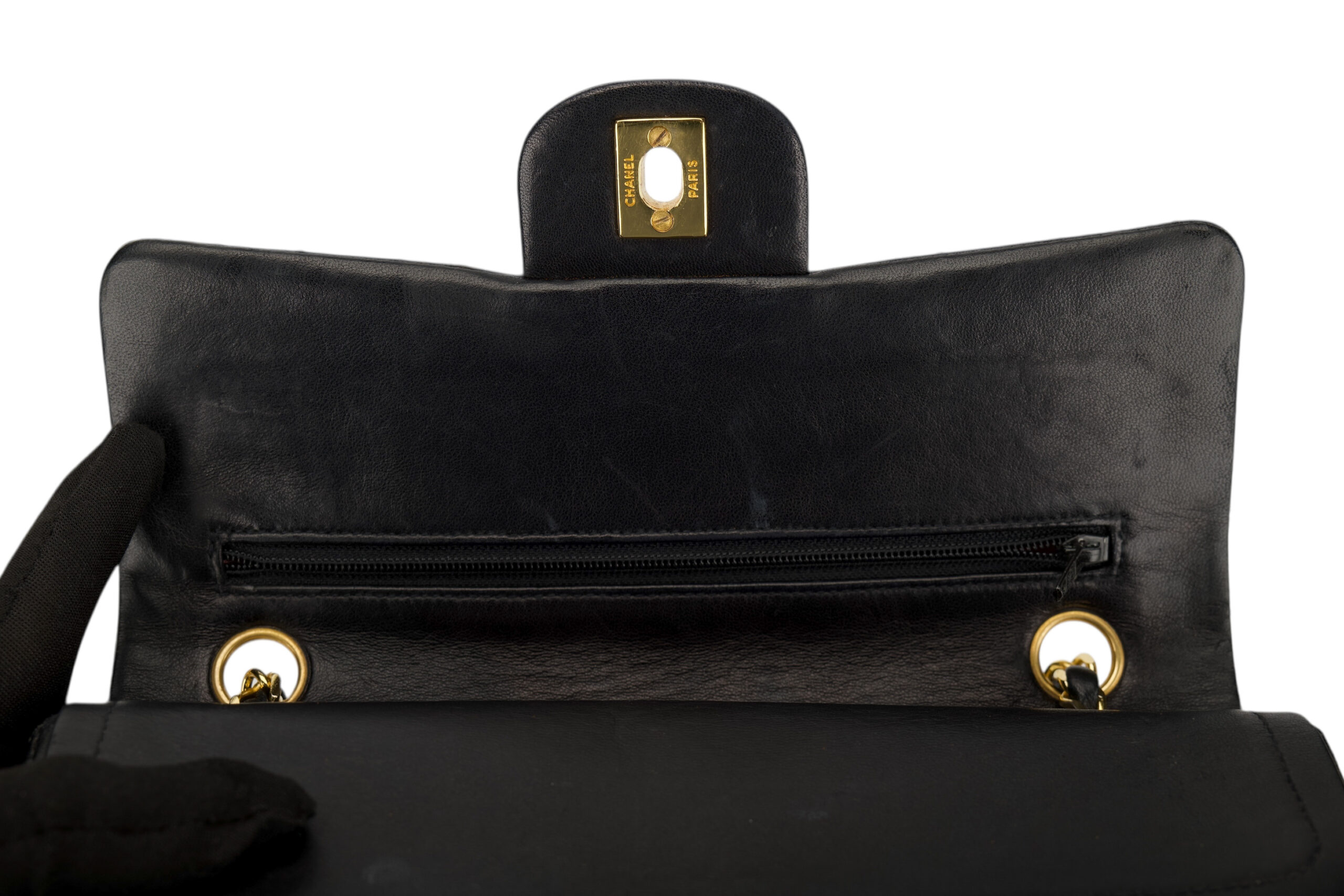Indulge in timeless elegance with this medium vintage double flap is crafted from black lambskin leather and has a gold-tone hardware finish, featuring a front flap with CC turn-lock closure, exterior back slip pocket, chain shoulder strap, and interior zip and slip pocket.