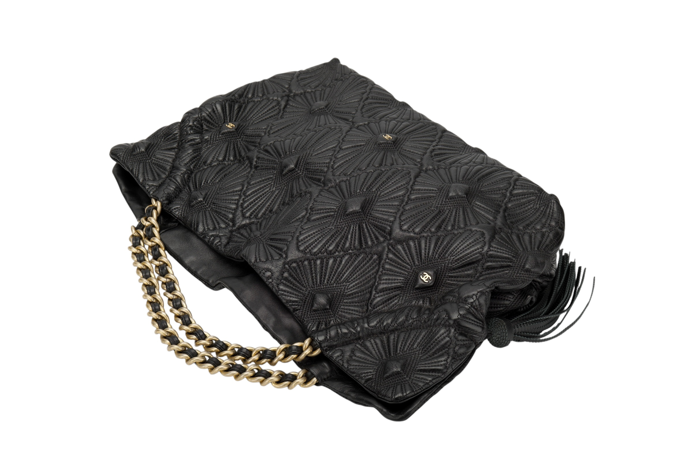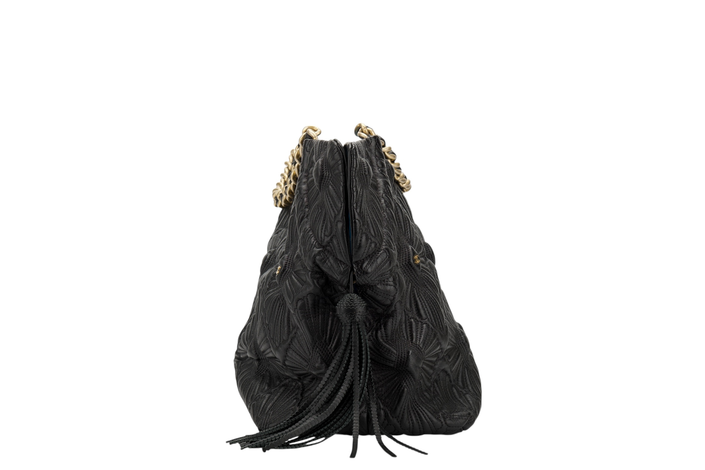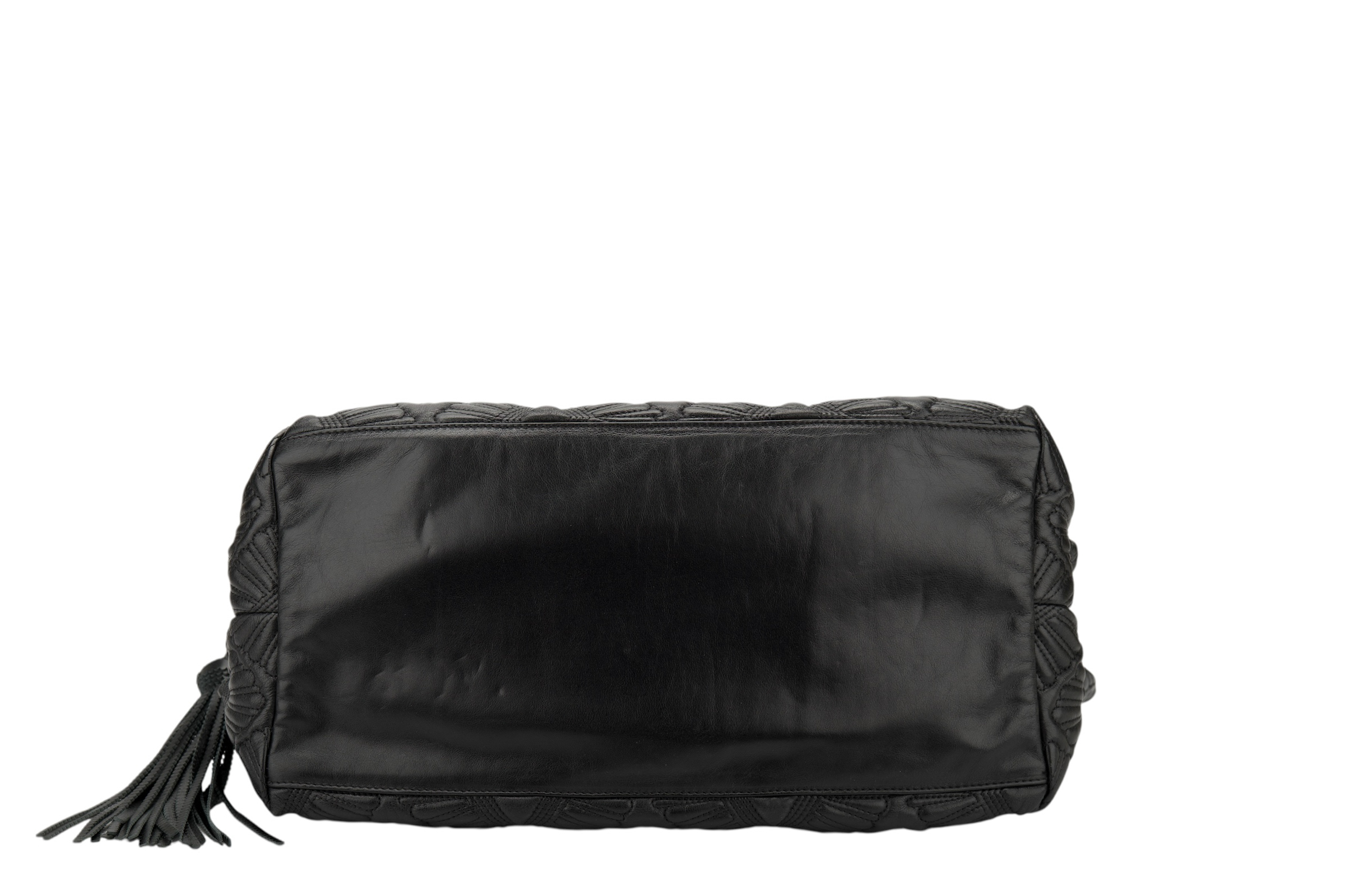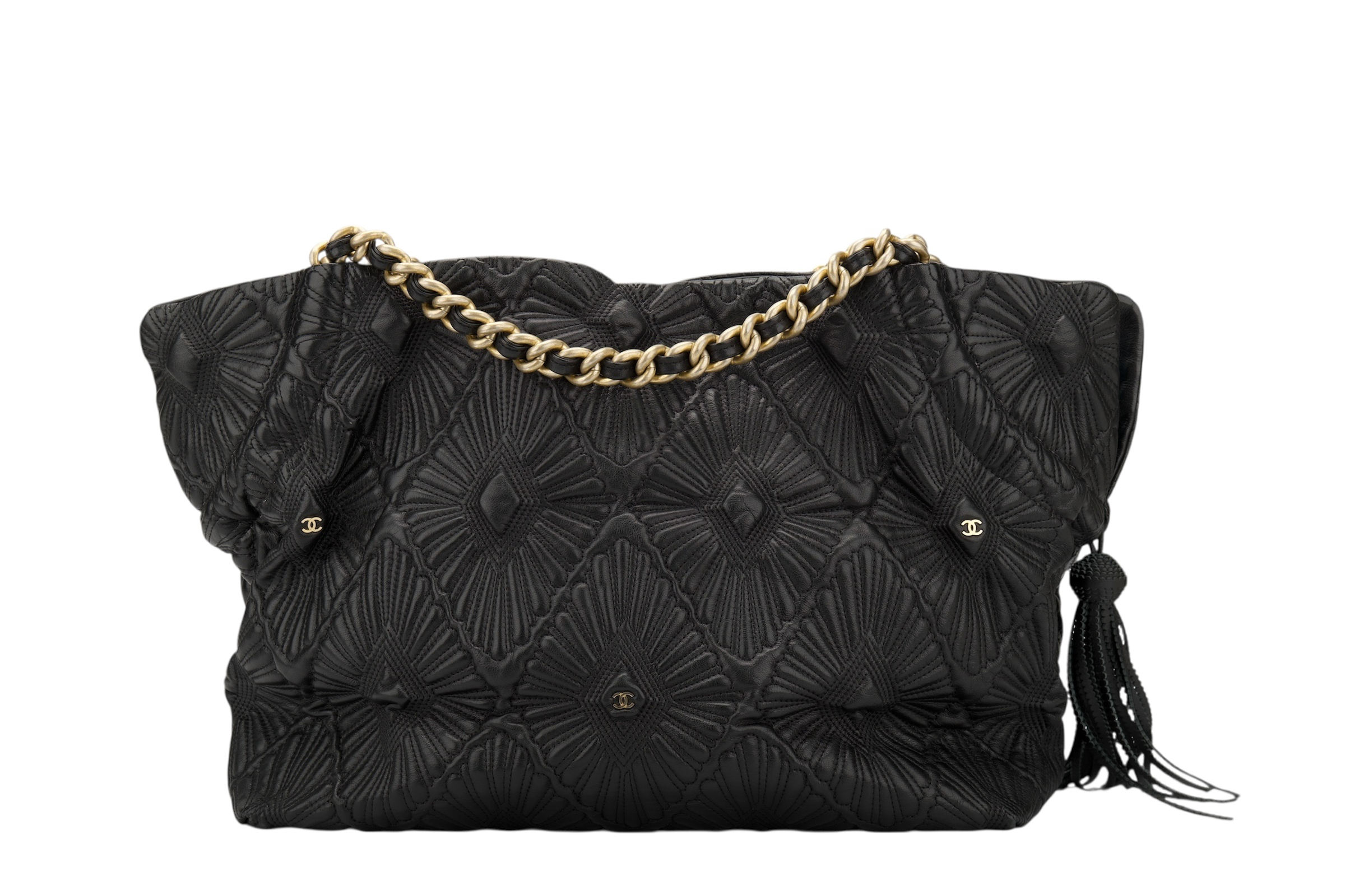 This exquisite handbag is the Chanel Vintage Da’Oro Quilted Medium Tote, a rare gem that effortlessly marries opulence with timeless sophistication. Crafted from sumptuous black leather, the bag features an intricately detailed diamond-quilted pattern, elevated by fan-like stitching that creates a dimensional, textural allure. A standout design element is the luxurious gold-tone chain shoulder strap, interwoven with leather in classic Chanel fashion, offering both comfort and elegance. The discreet yet iconic CC logo punctuates the body of the bag in several places, harmoniously blending heritage with subtlety. Topped off with a playful leather tassel, this tote pays homage to Chanel’s legacy of refined, detail-driven craftsmanship, ideal for the modern woman who adores a touch of vintage glamour.