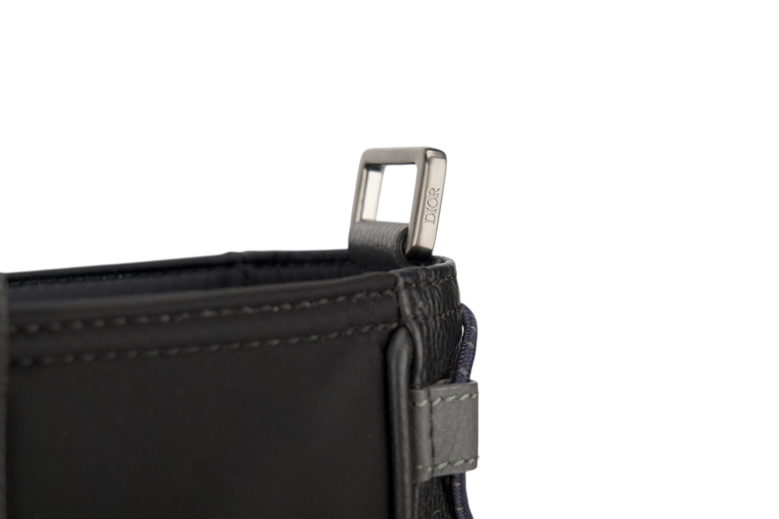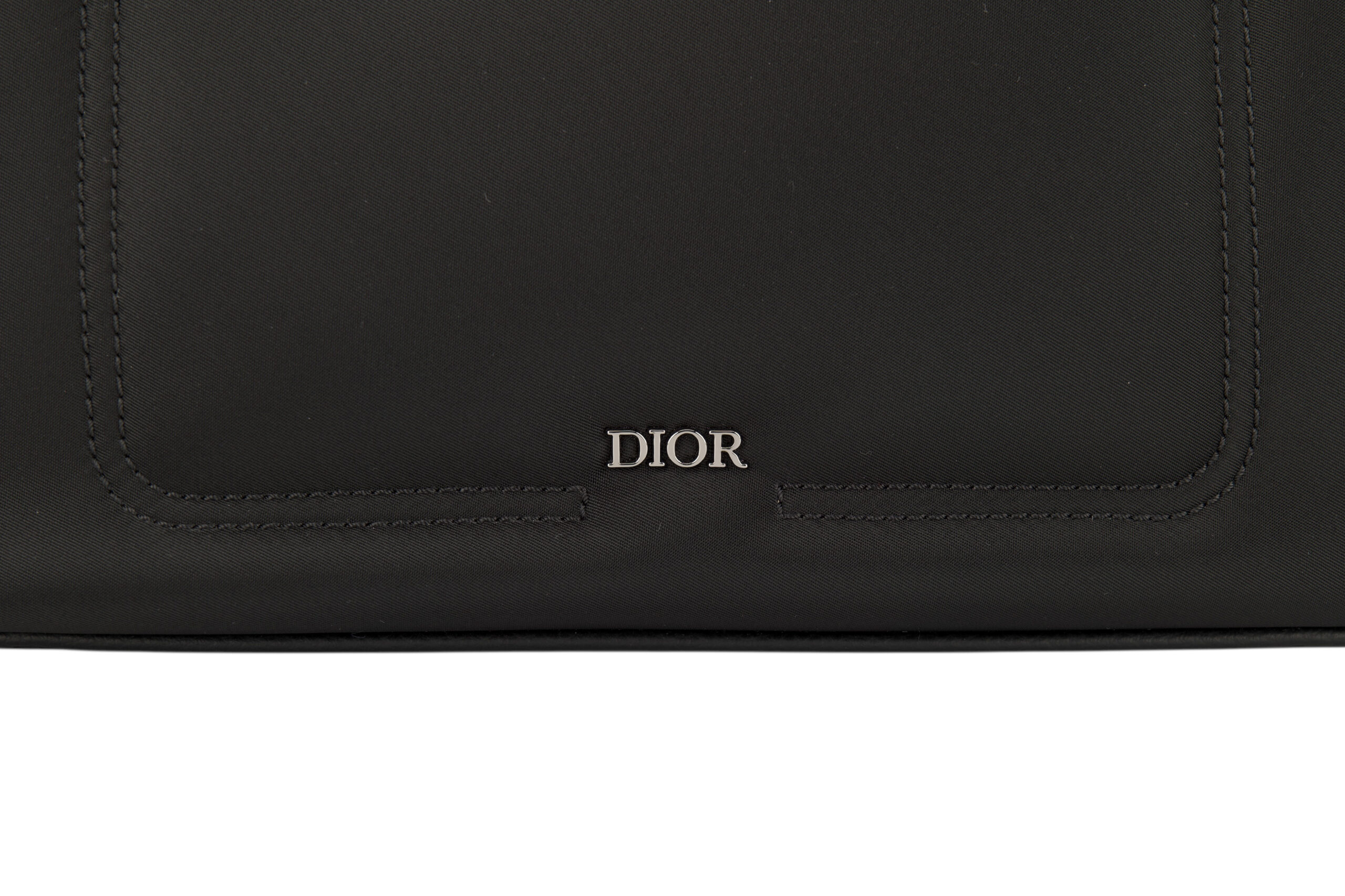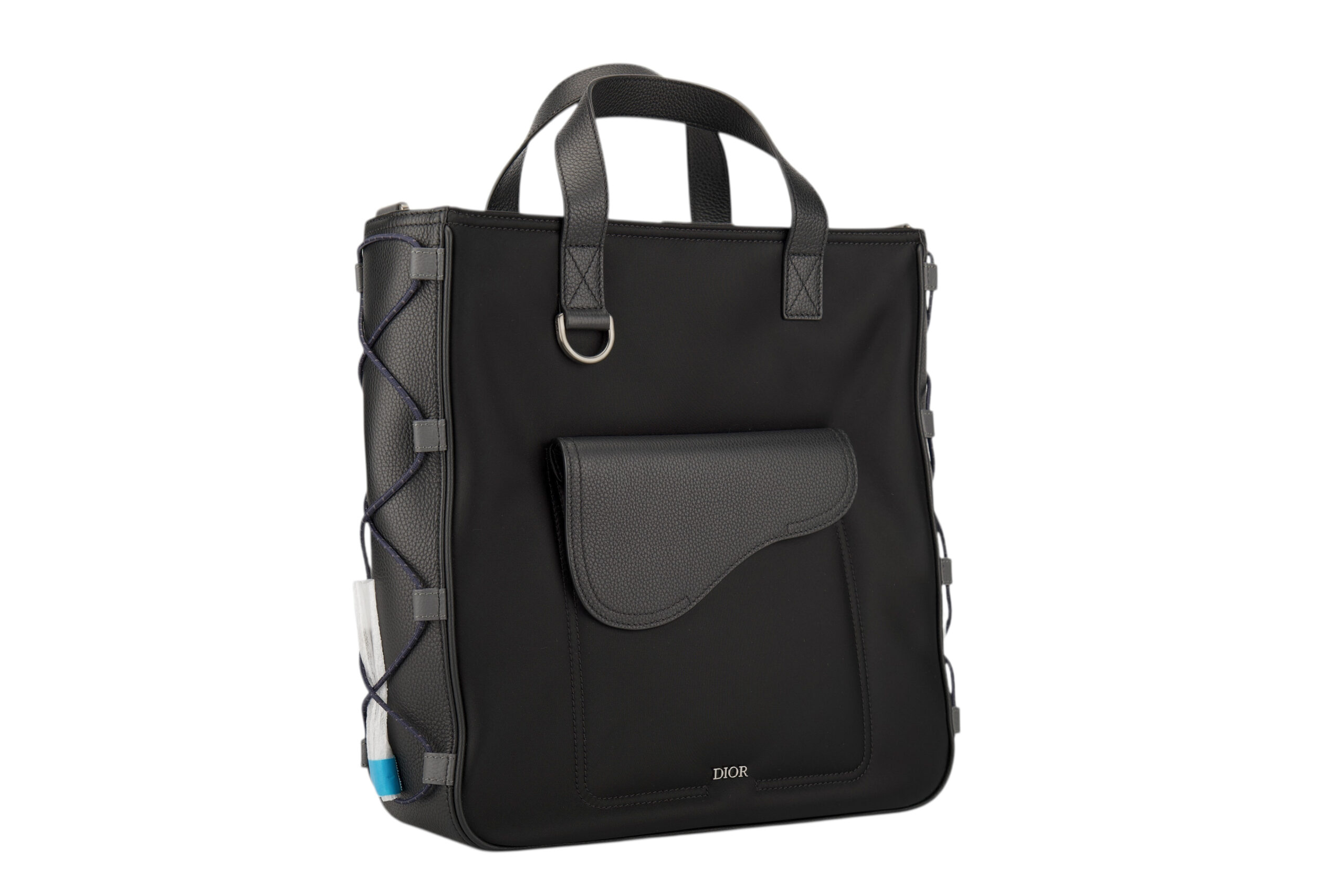 The Dior North South Medium Tote in black canvas and leather is a masterclass in functional luxury with an urban edge. This tote pairs structured, durable canvas with refined pebbled leather detailing, inlacing an asymmetrical front flap pocket that lends a bold, architectural feel. The sleek matte black hardware, including the subtle DIOR logo at the base, keeps the aesthetic minimal and contemporary, while the double top handles offer a solid grip for daily wear. The open-top design and generous interior make it ideal for work and travel, balancing capacity with understated sophistication