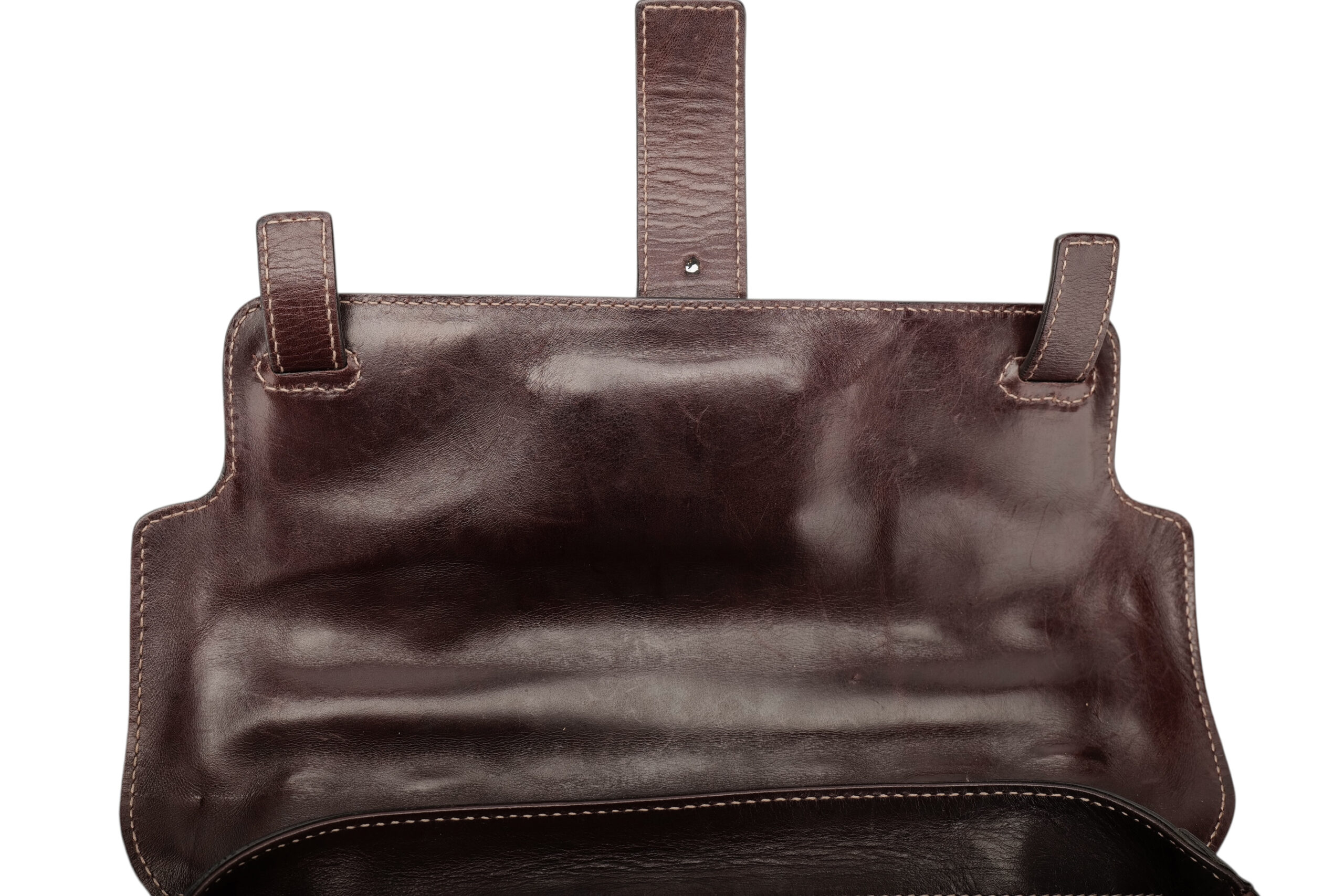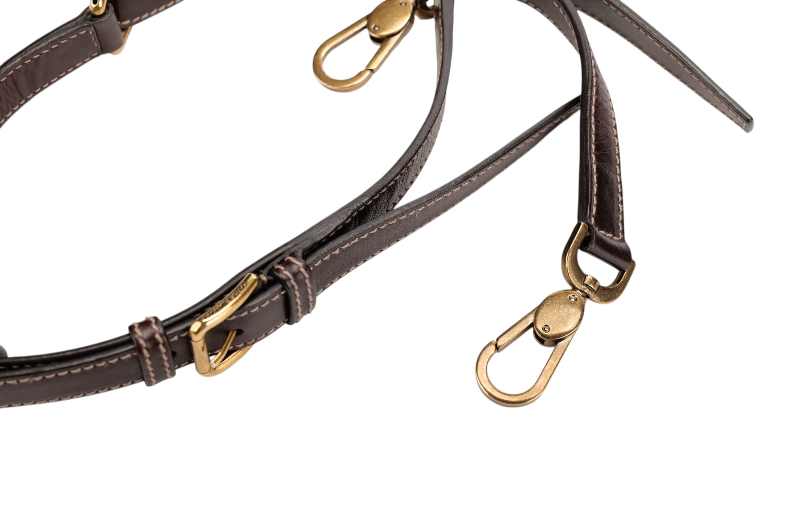 This Dolce & Gabbana Via San Damiano satchel embodies the brand’s love for Italian heritage, craftsmanship, and bold detailing. Crafted in richly grained brown leather, the bag features structured paneling, contrast stitching, and signature gold-tone hardware that lends it a refined yet commanding presence. The front buckle strap, dual top handles, and prominent branded plaque evoke classic D&G design codes from the early 2000s—an era known for luxurious textures, architectural silhouettes, and unapologetic glamour.