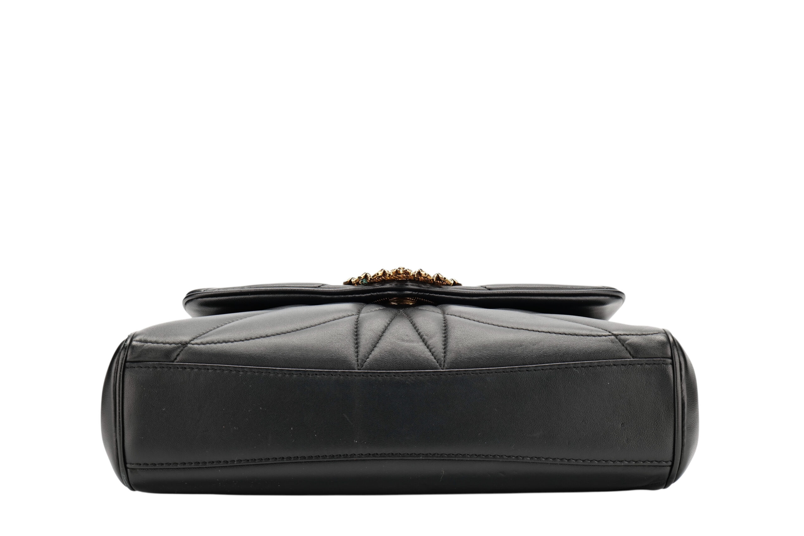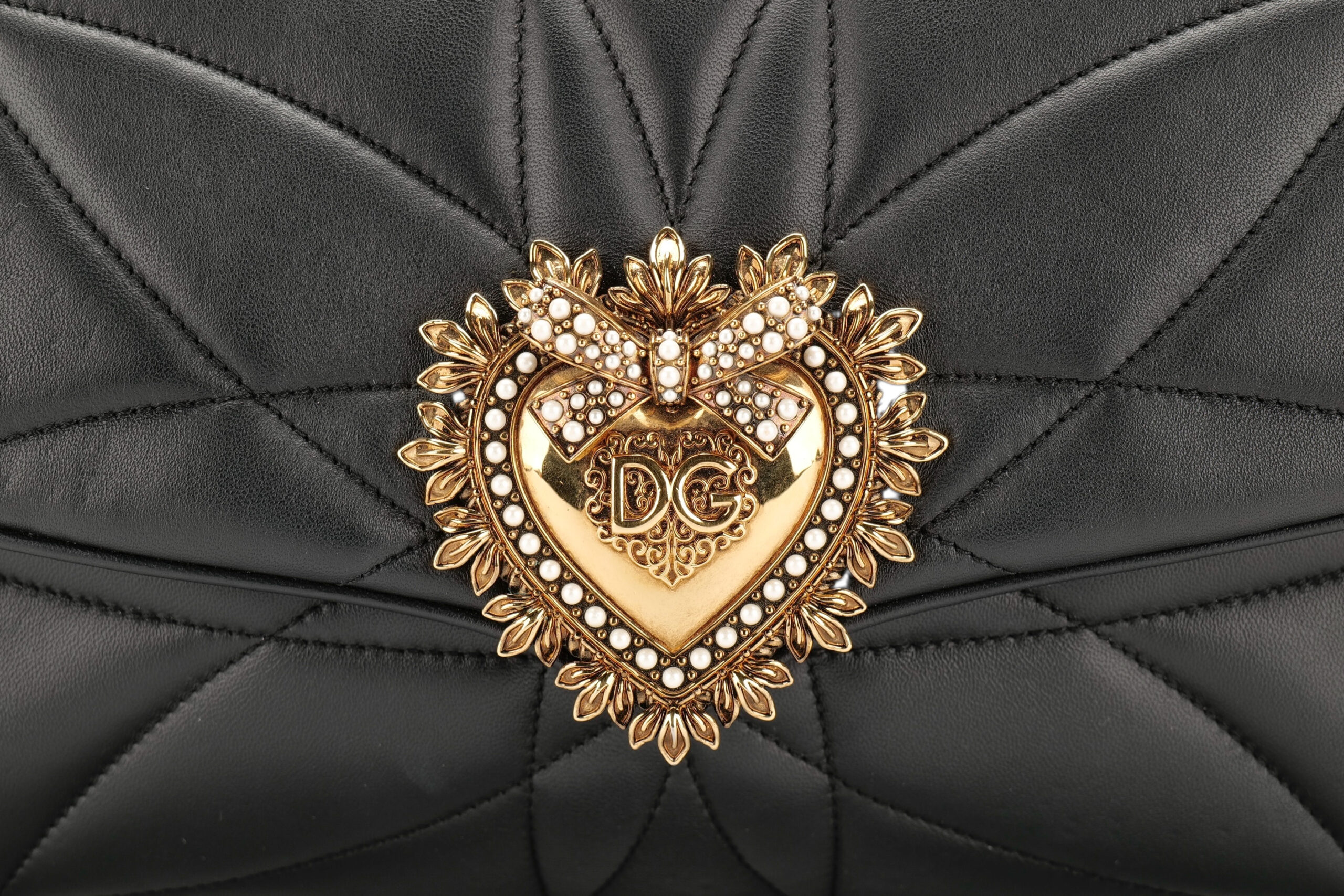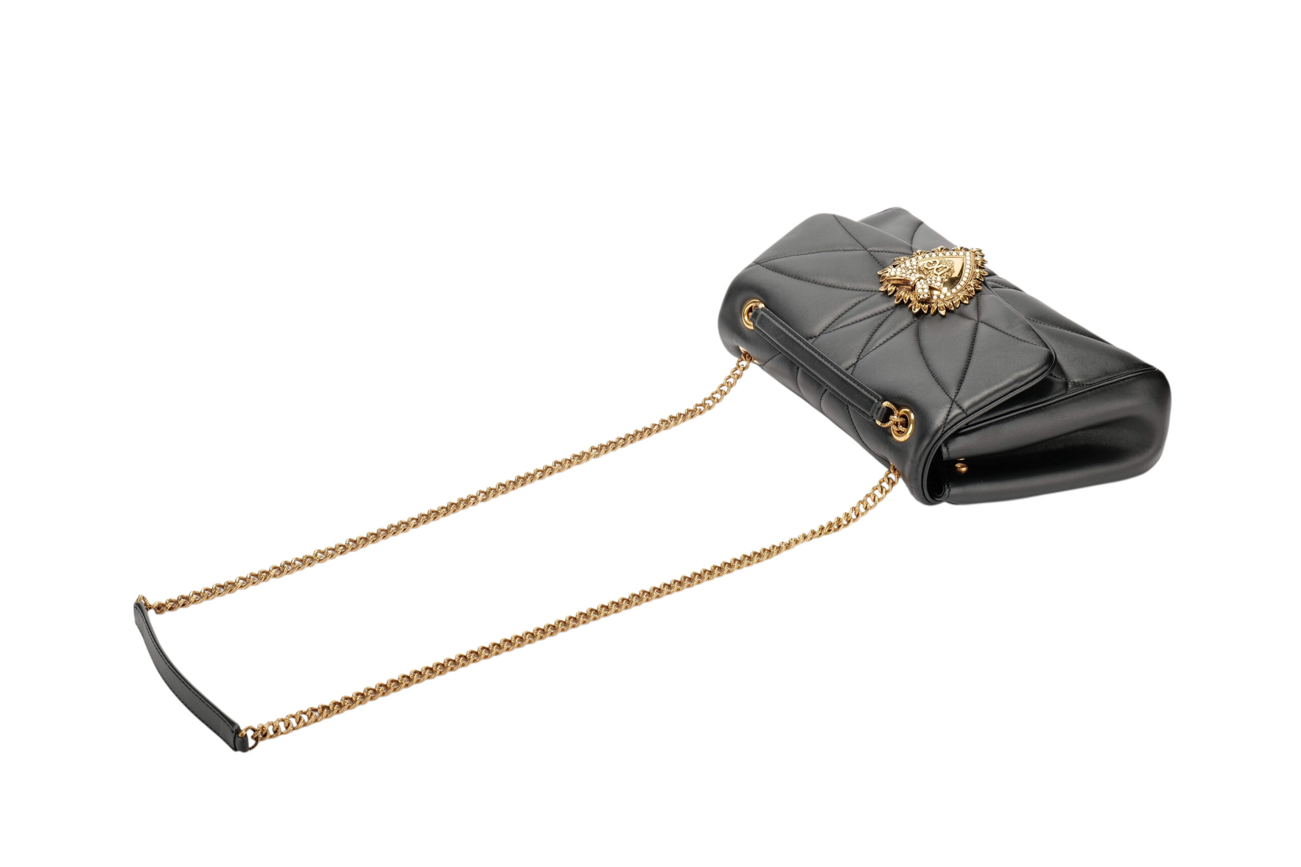 Indulge in luxury with this Dolce&Gabbana Devotion bag. Meticulously crafted from premium materials, it combines exquisite design, impeccable craftsmanship, and timeless elegance. The Devotion collection are refined and elegant styles. It is in medium size and made with black quilted leather and aged gold-tone hardware. On the front flap is an intricately detailed Devotion emblem, shaped as a sacred heart, with embedded pearls. It comes with a finely engraved crossbody chain for easy carrying