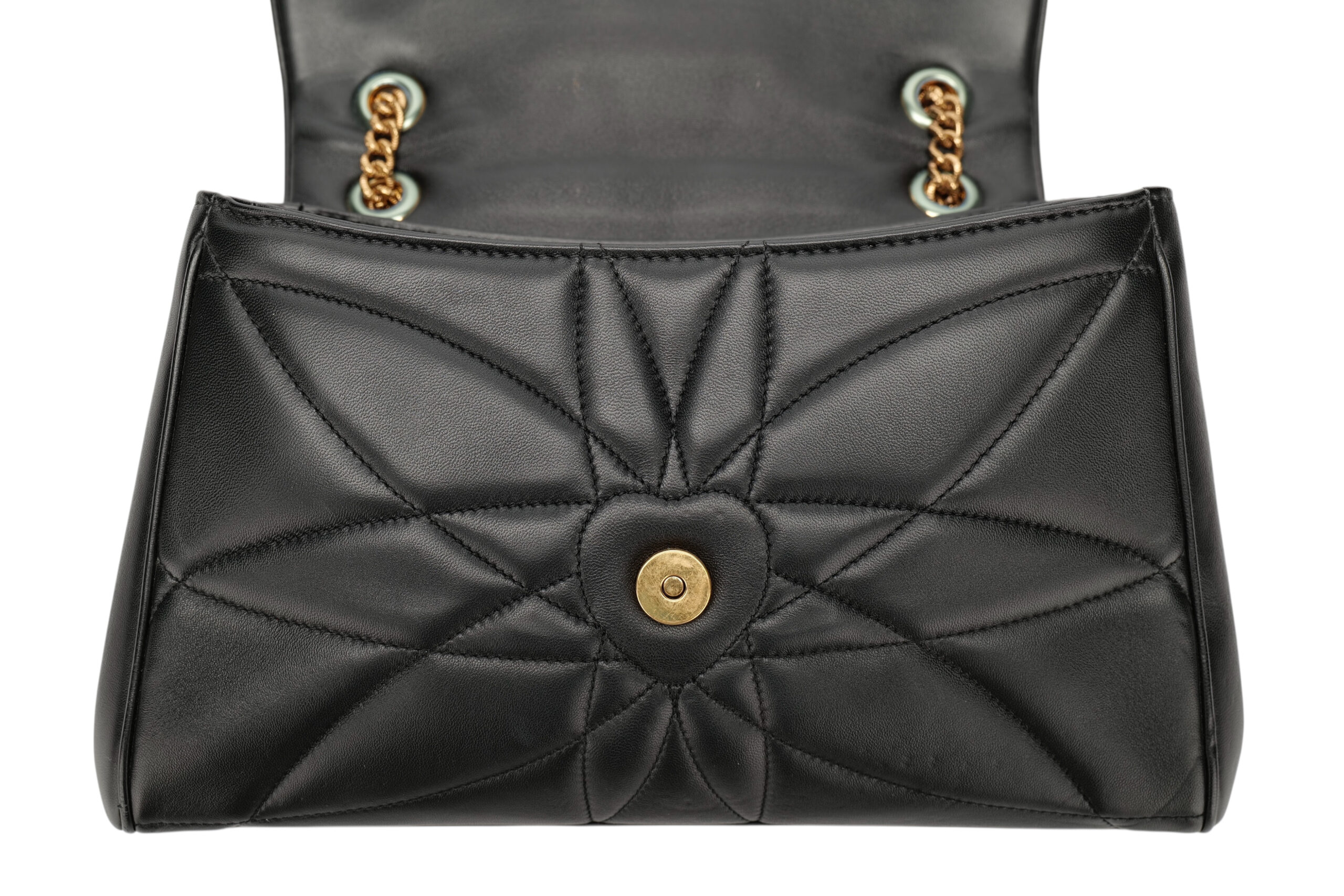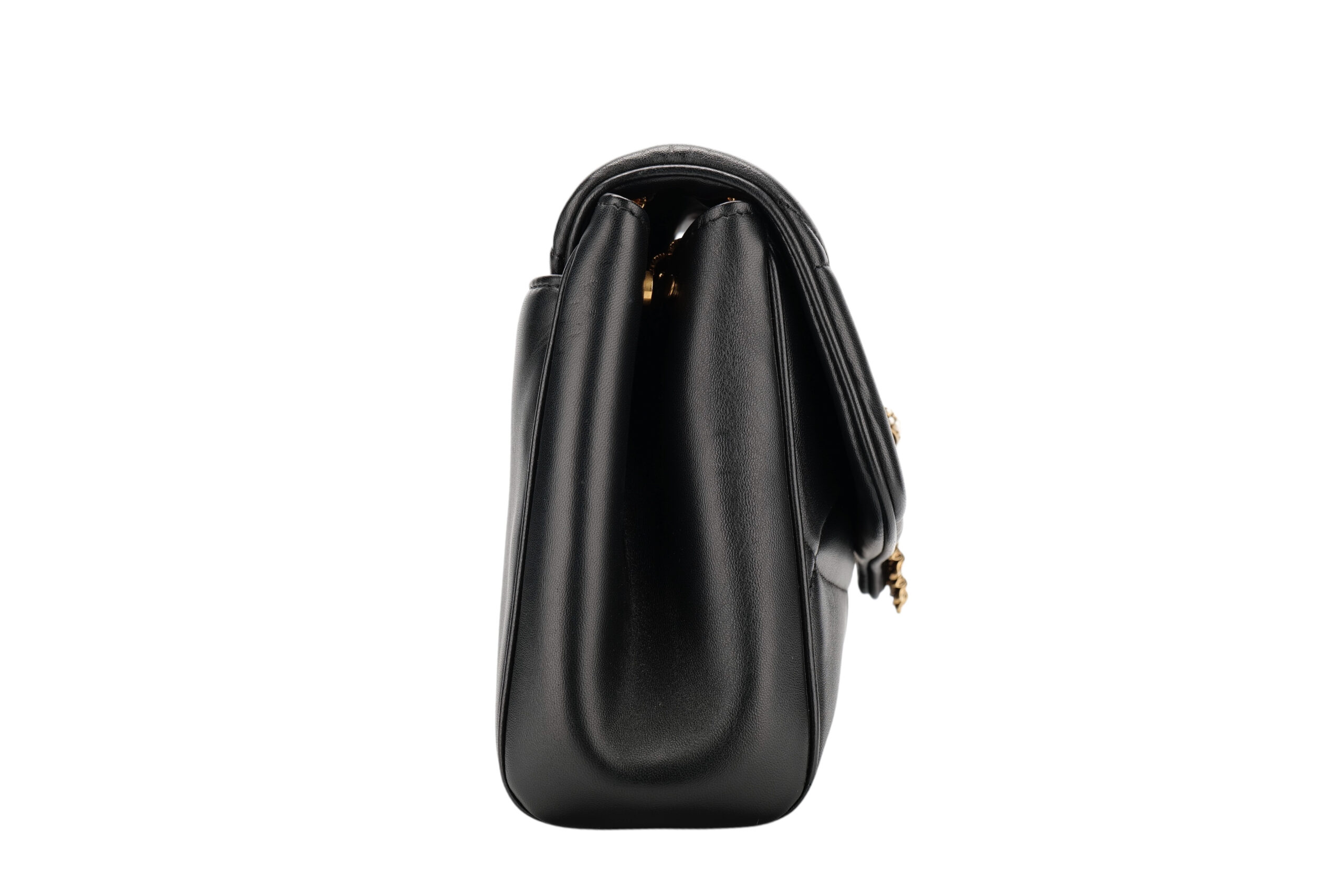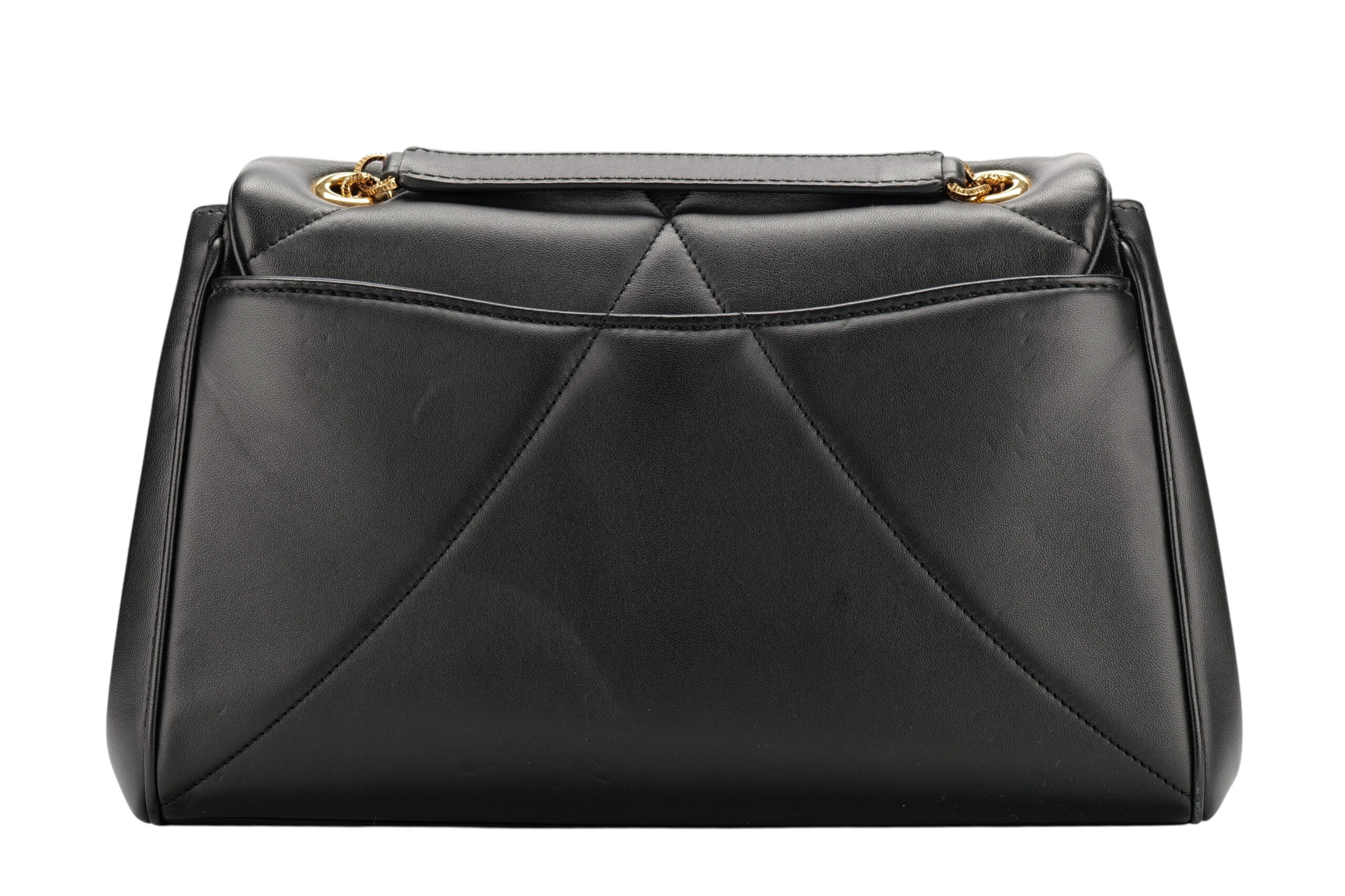 Indulge in luxury with this Dolce&Gabbana Devotion bag. Meticulously crafted from premium materials, it combines exquisite design, impeccable craftsmanship, and timeless elegance. The Devotion collection are refined and elegant styles. It is in medium size and made with black quilted leather and aged gold-tone hardware. On the front flap is an intricately detailed Devotion emblem, shaped as a sacred heart, with embedded pearls. It comes with a finely engraved crossbody chain for easy carrying