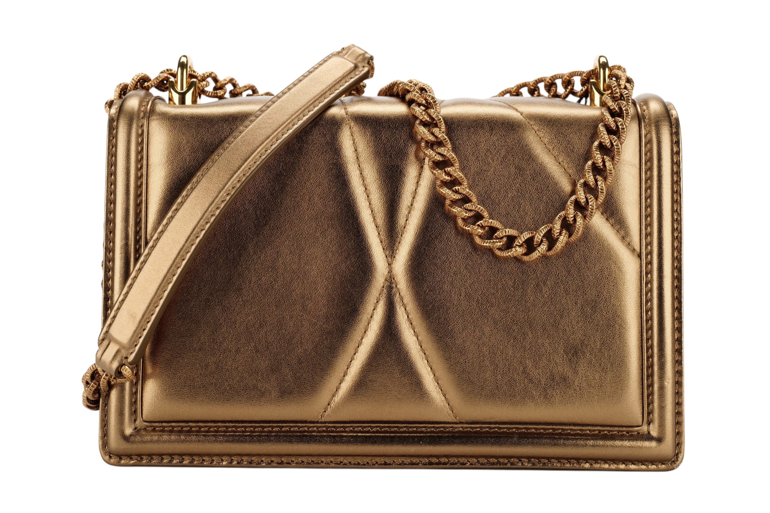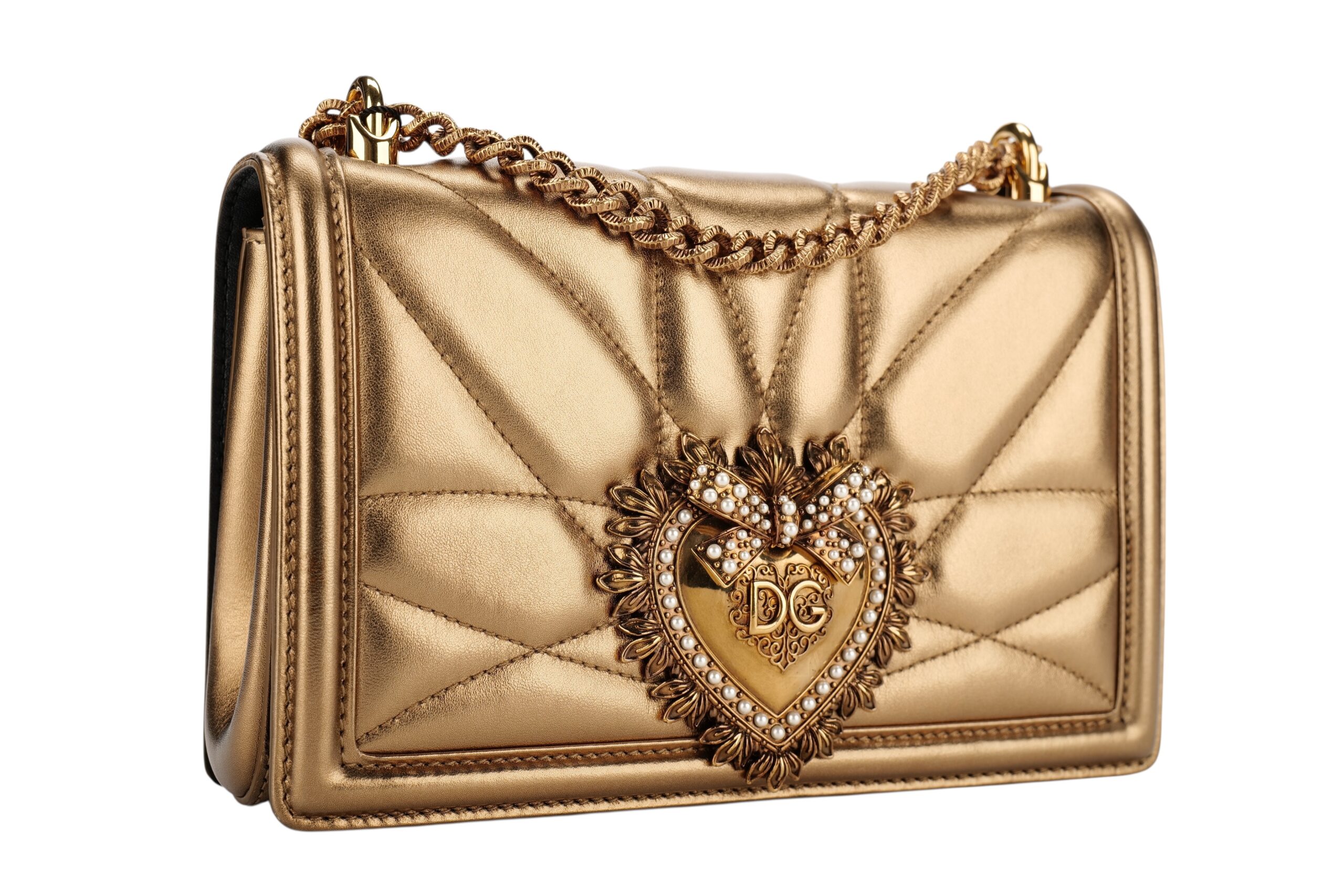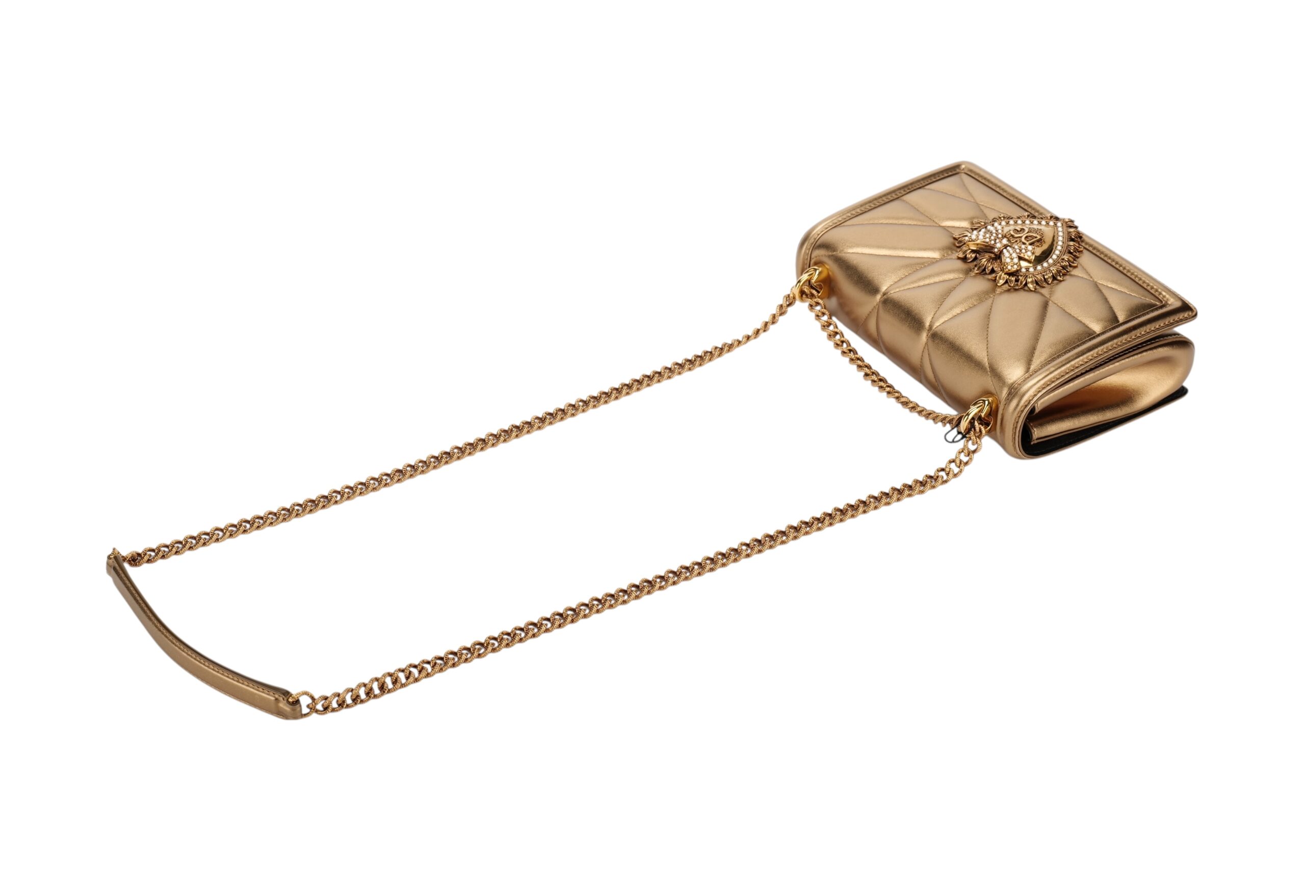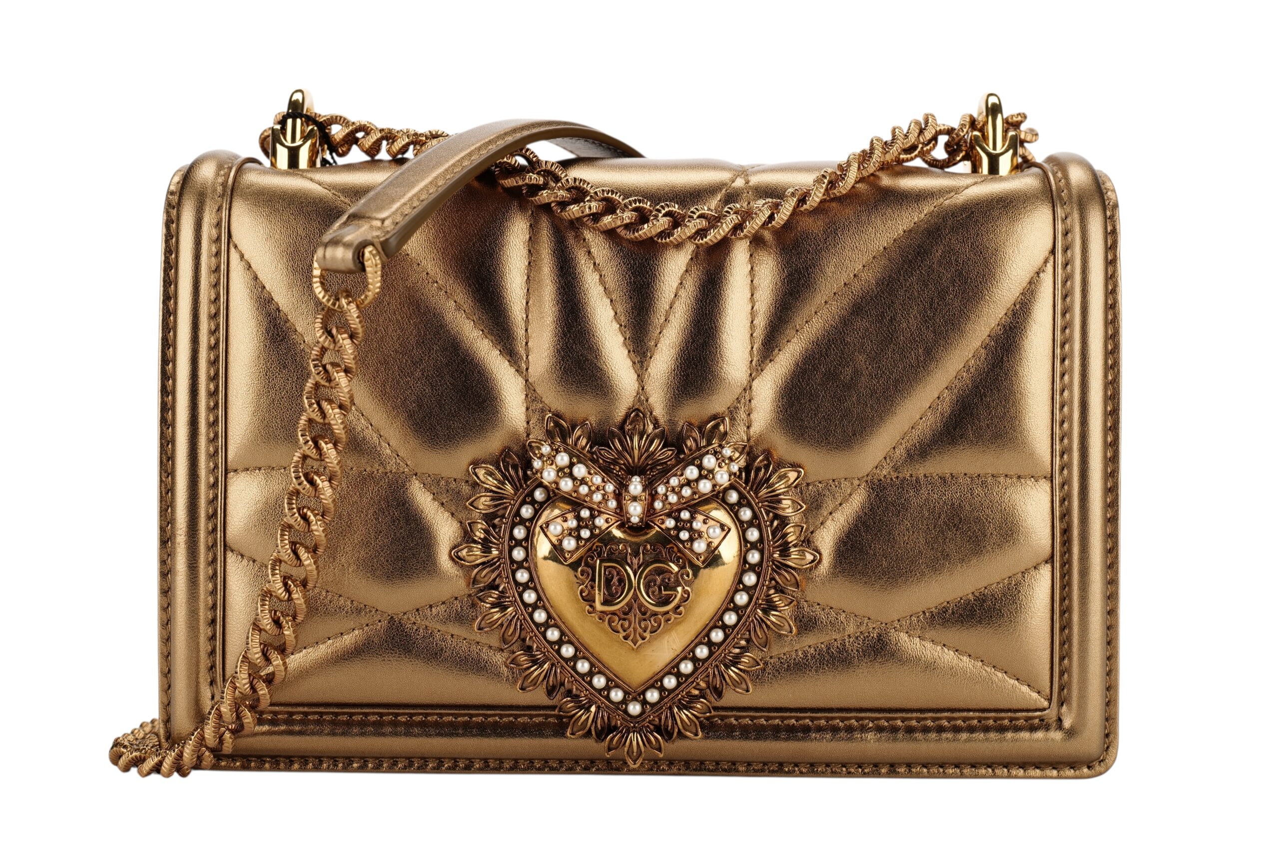 Indulge in luxury with this Dolce&Gabbana Devotion bag. Meticulously crafted from premium materials, it combines exquisite design, impeccable craftsmanship, and timeless elegance. The Devotion collection are refined and elegant styles. It is in medium size and made with metallic bronze quilted leather and aged gold-tone hardware. On the front flap is an intricately detailed Devotion emblem, shaped as a sacred heart, with embedded pearls. It comes with a finely engraved crossbody chain for easy carrying