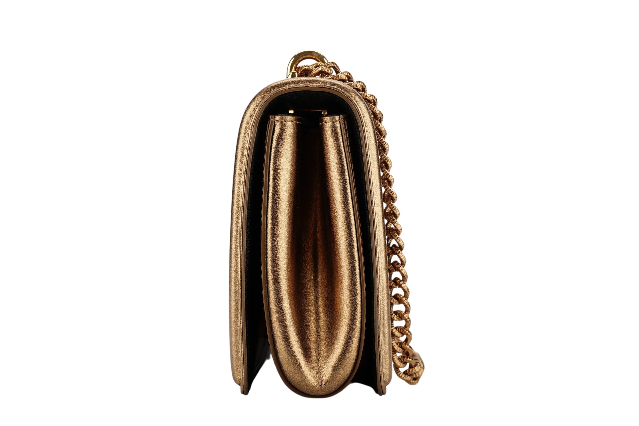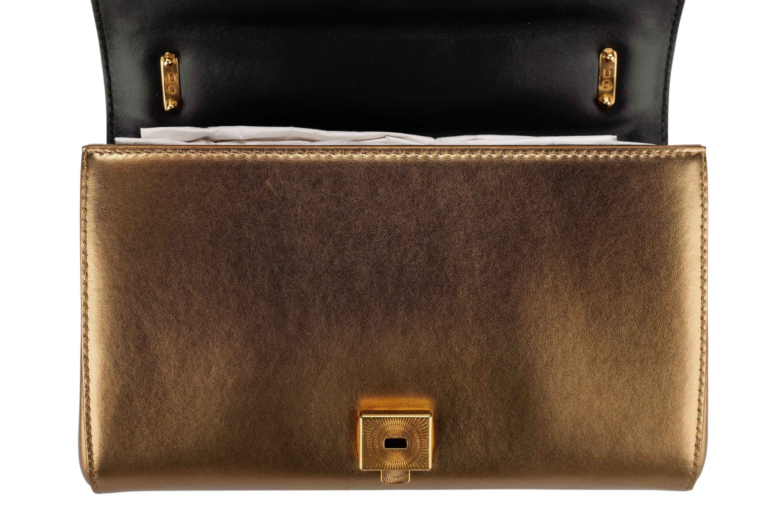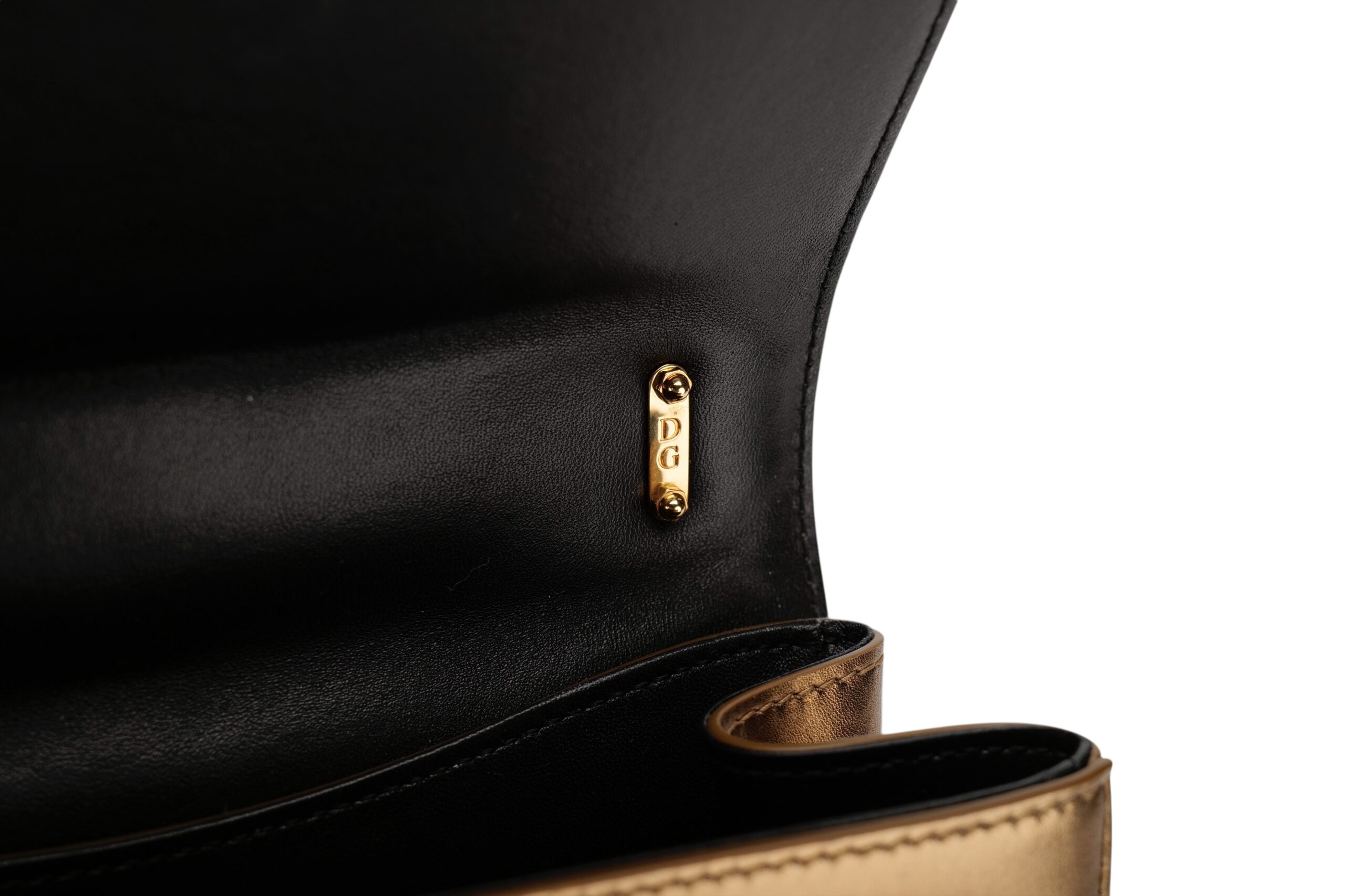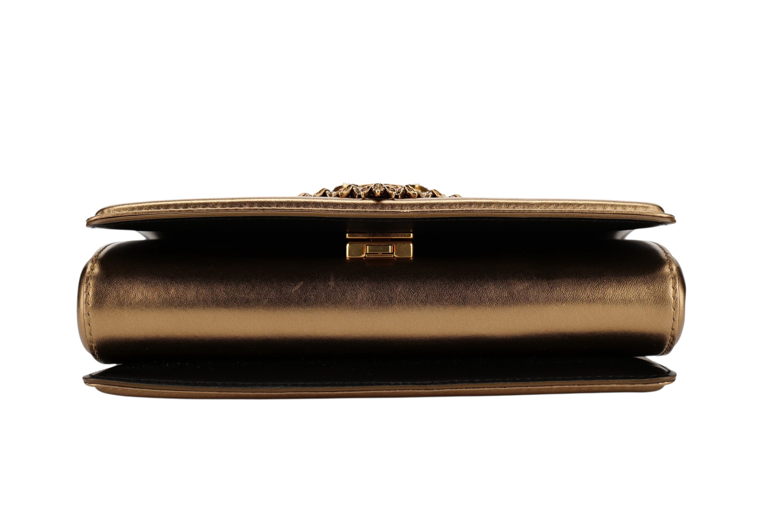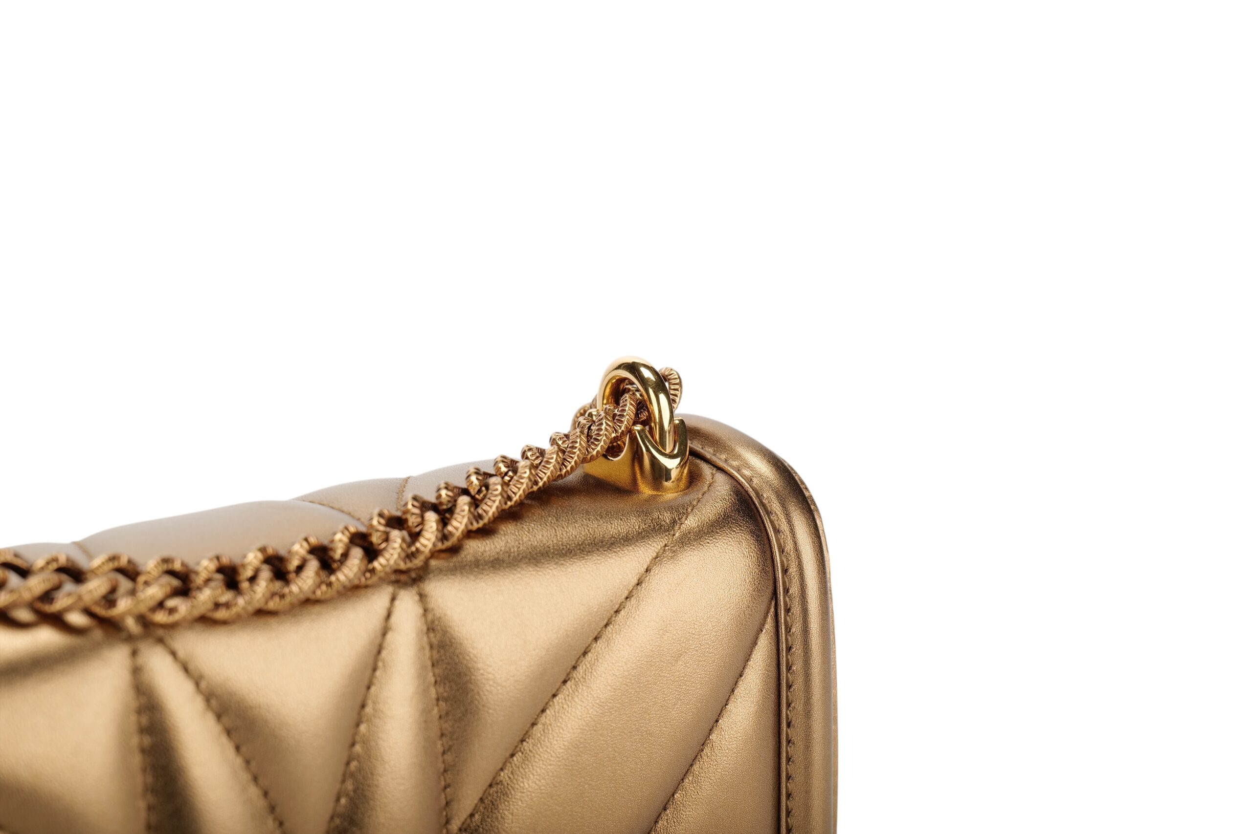 Indulge in luxury with this Dolce&Gabbana Devotion bag. Meticulously crafted from premium materials, it combines exquisite design, impeccable craftsmanship, and timeless elegance. The Devotion collection are refined and elegant styles. It is in medium size and made with metallic bronze quilted leather and aged gold-tone hardware. On the front flap is an intricately detailed Devotion emblem, shaped as a sacred heart, with embedded pearls. It comes with a finely engraved crossbody chain for easy carrying