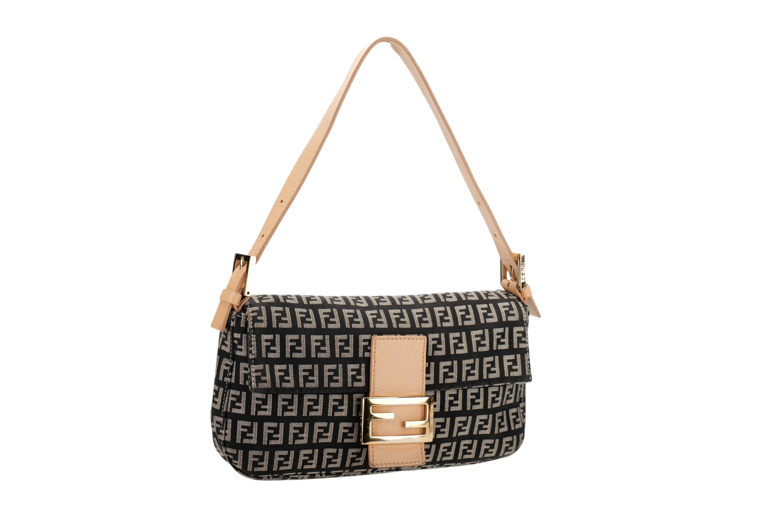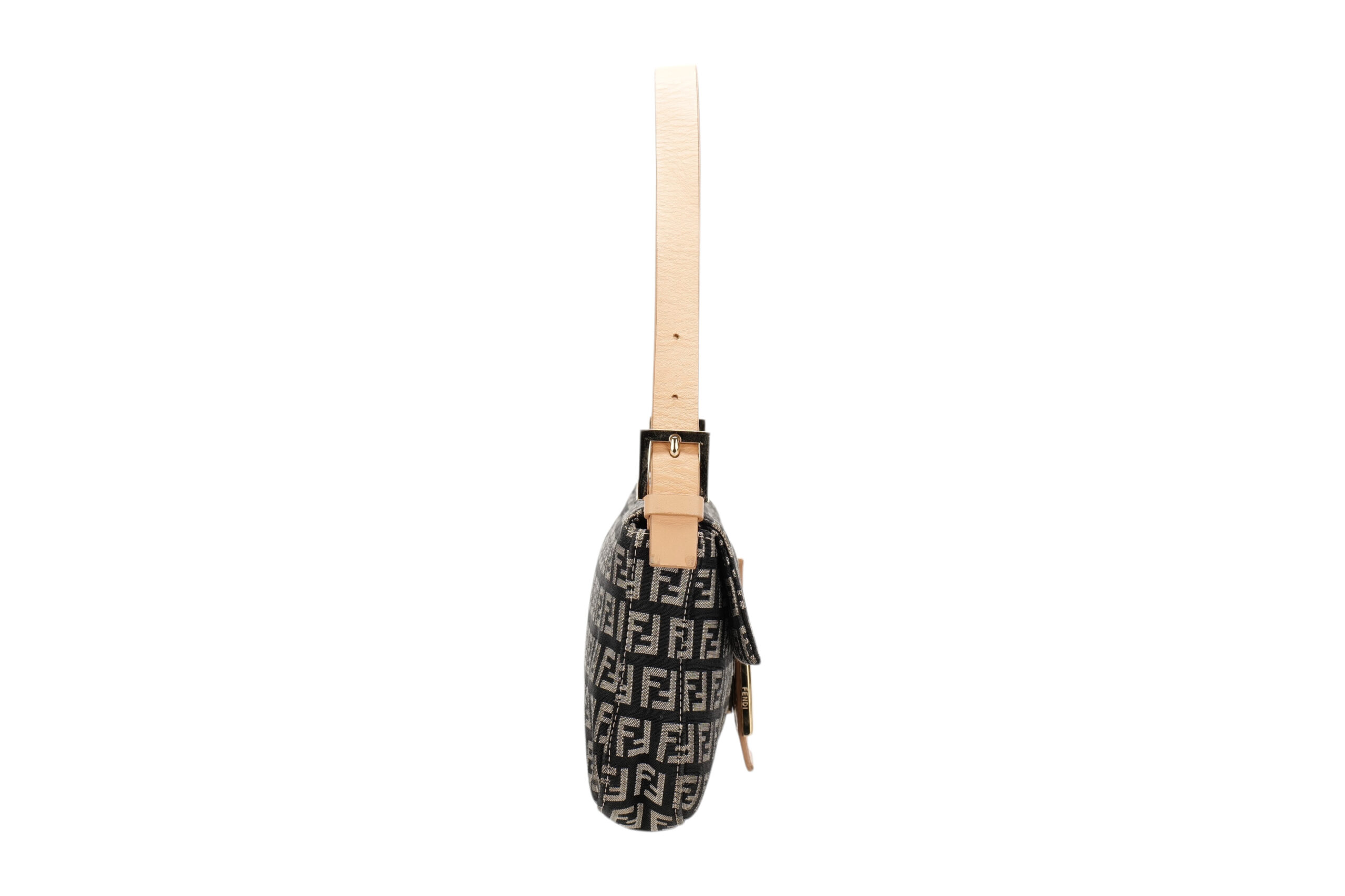 The Fendi Zucca Baguette is an iconic shoulder bag that perfectly captures the spirit of early-2000s luxury, crafted in the House’s instantly recognisable black and cream Zucca FF canvas. The compact, structured silhouette is balanced by smooth tan leather trim and an adjustable shoulder strap, allowing it to sit effortlessly under the arm. Front and center, the polished gold-tone FF logo clasp serves as both a closure and a bold statement, reinforcing the bag’s status as a true Fendi classic.