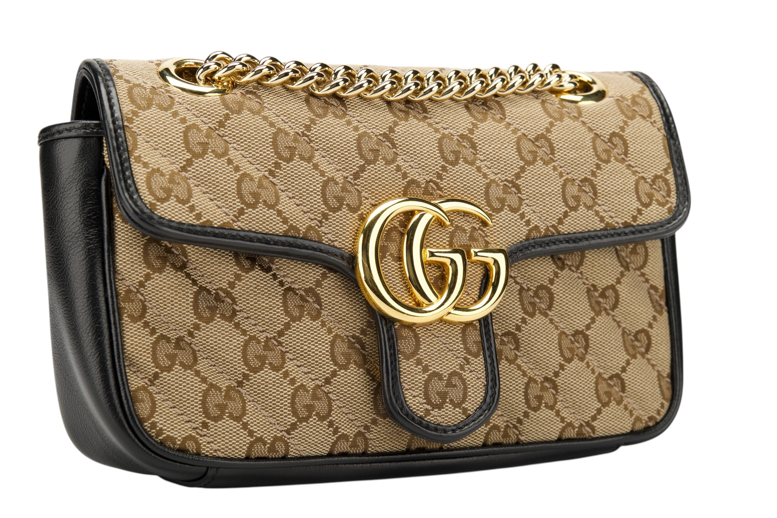 This luxurious handbag is the Gucci GG Marmont Small Shoulder Bag, crafted in the brand’s signature beige and ebony GG Supreme coated canvas. Framed with smooth black leather trim, the structured silhouette is adorned with the iconic double G hardware in polished antique gold, a nod to the house’s rich heritage. A sliding chain strap with leather detail allows for both shoulder and crossbody styling, while the flap closure with a hidden spring mechanism adds security and sophistication.