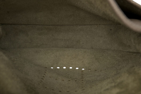 Remaining true to its nomadic roots, the Evelyne bag adapts seamlessly to the wearer’s rhythm. Originally designed to transport equestrian equipment, its reinterpretation strikes the perfect balance between function and fashion. This sporty bag is a true testament to its equestrian heritage, preserving the original shoulder strap and oval hoof-print. The H-shaped perforation on the back, originally intended for drying grooming accessories, adds a unique touch of functionality.