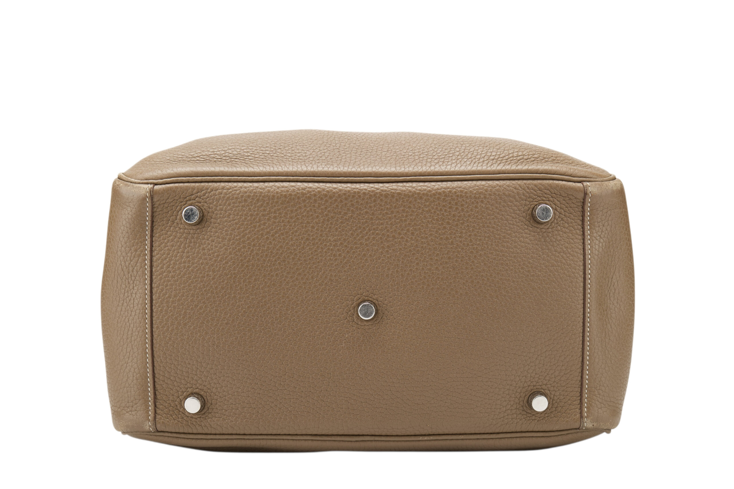 This Lindy is of Etoupe Togo with palladium hardware and features tonal stitching, double zipper pulls, centre Hermès twist lock closure, five palladium feet, and two top handles that are linked by a removable shoulder strap