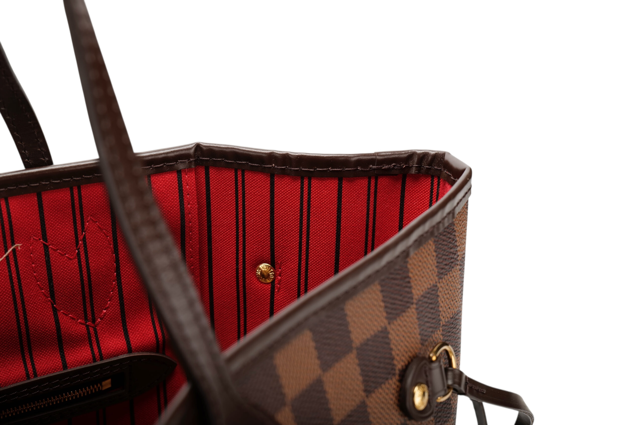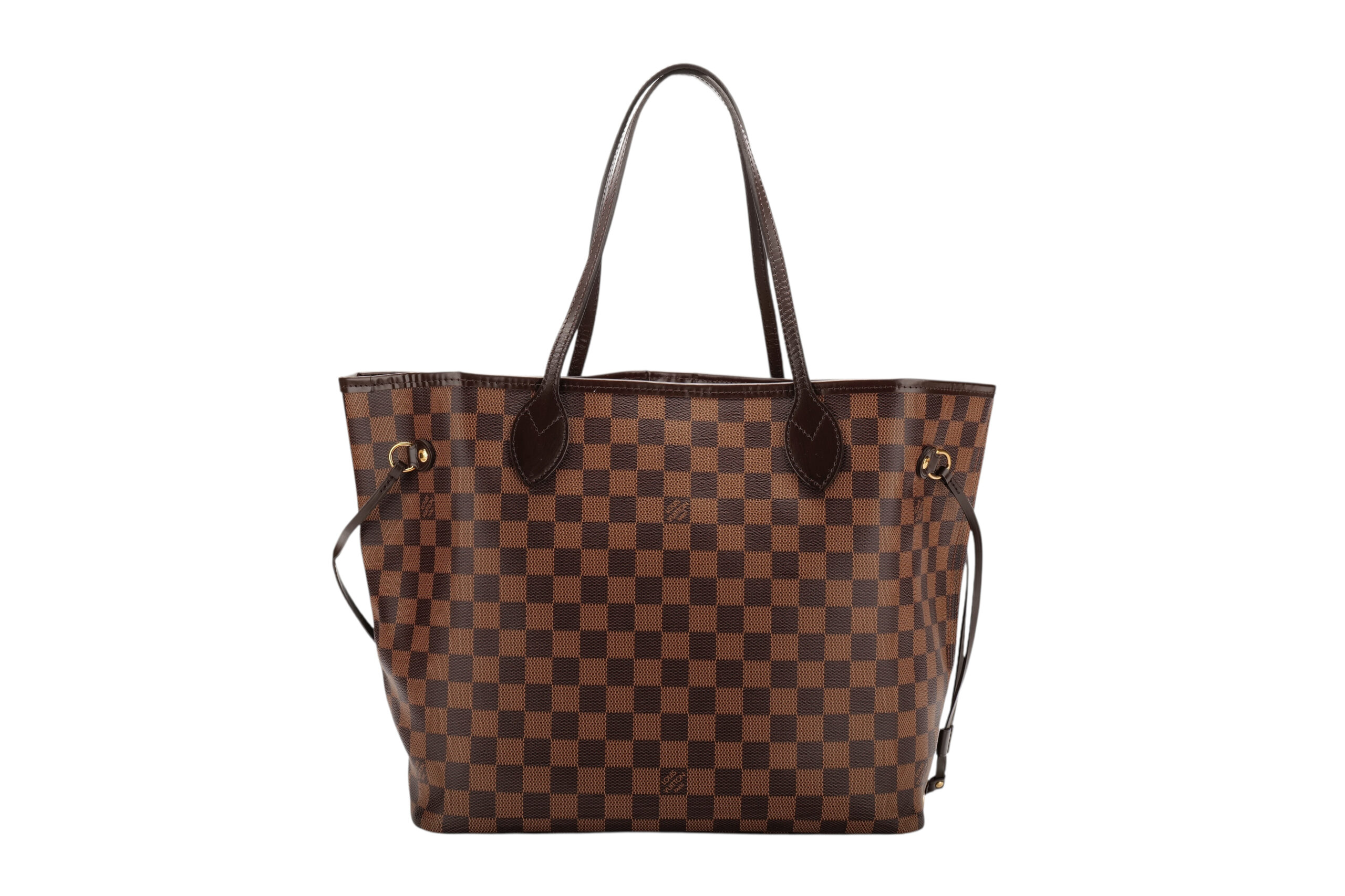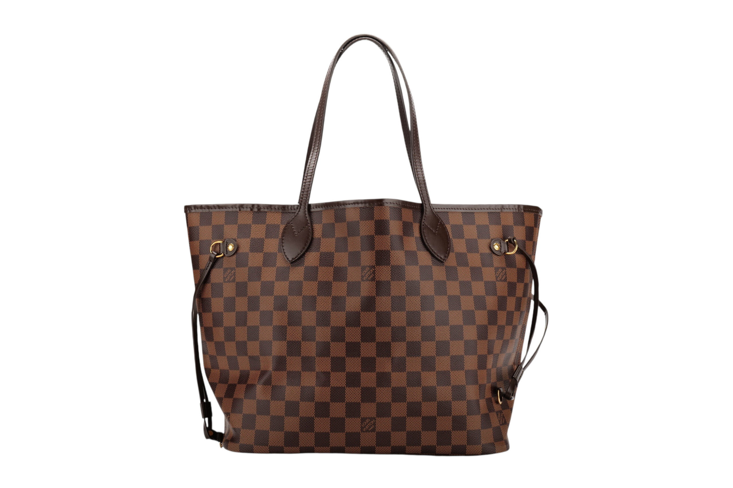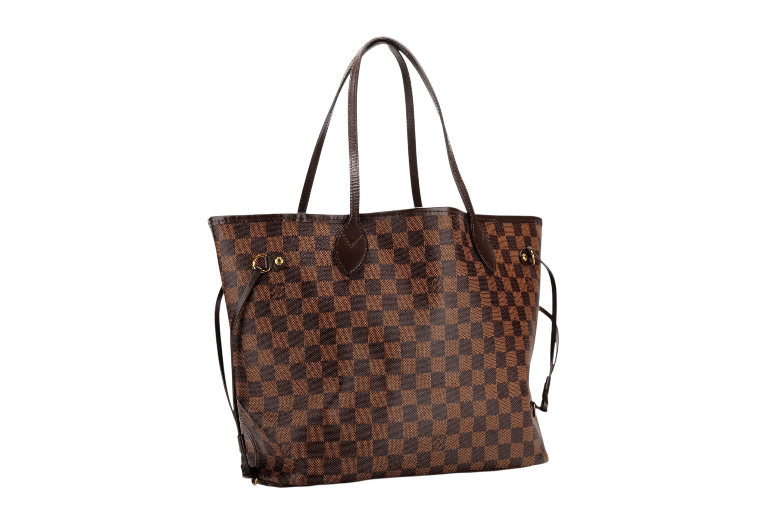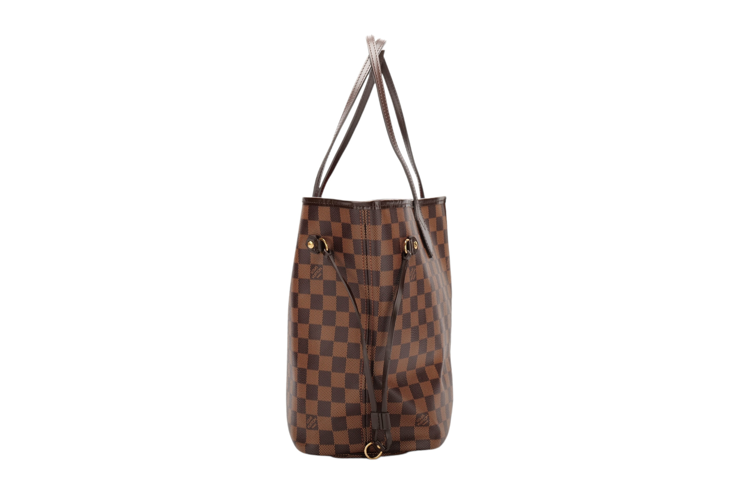 The Neverfull MM tote bag unites timeless design with heritage details. Elegant in Damier Ebene canvas with a natural cowhide trim, it is roomy but not bulky, with side laces that cinch for a sleek allure or loosen for a casual look. Slim, comfortable handles slip easily over the shoulder or arm. Lined in colourful textile, it features a removable pouch which can be used as a clutch or an extra pocket. This practical bag can easily fit a 13-inch laptop and other everyday essentials