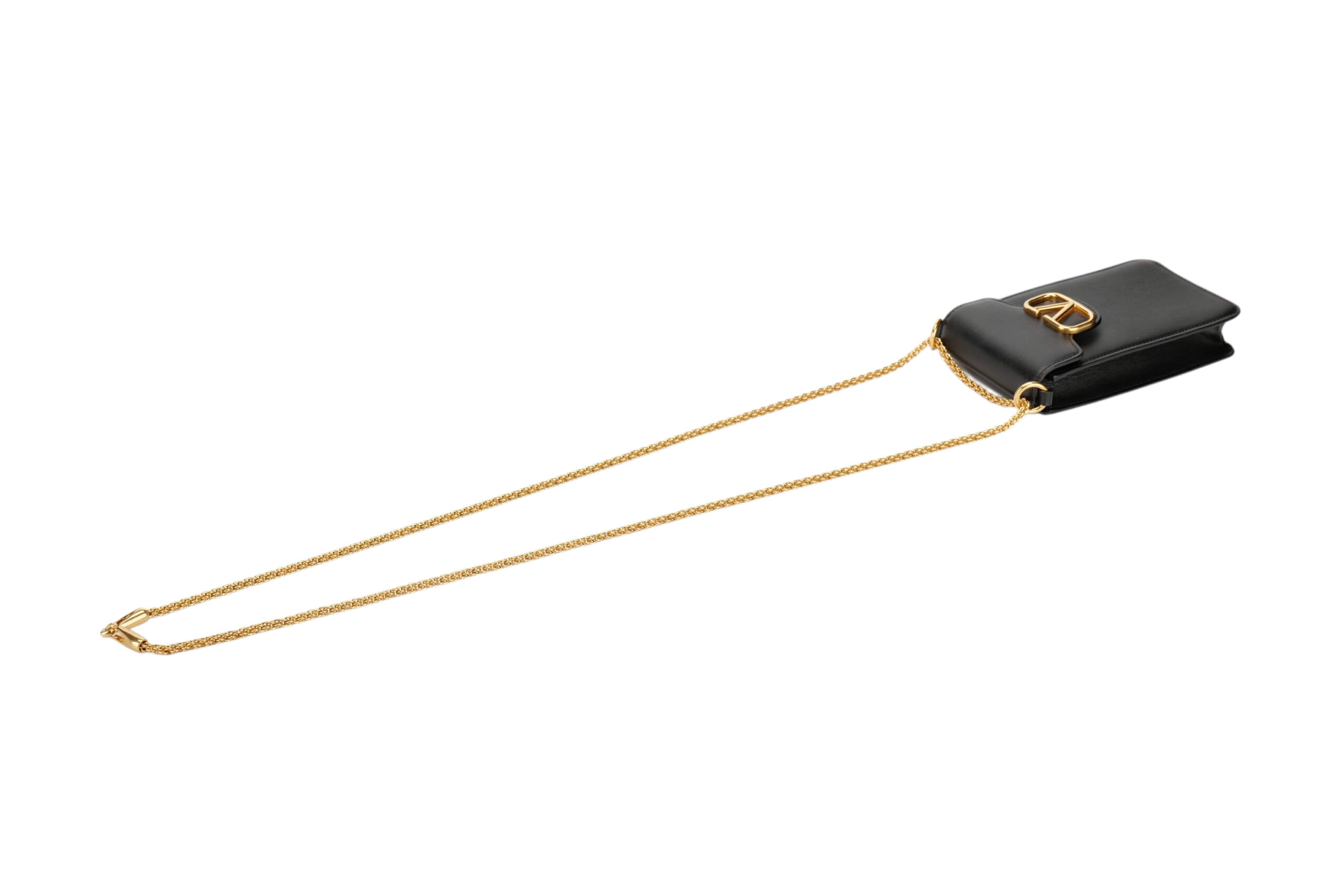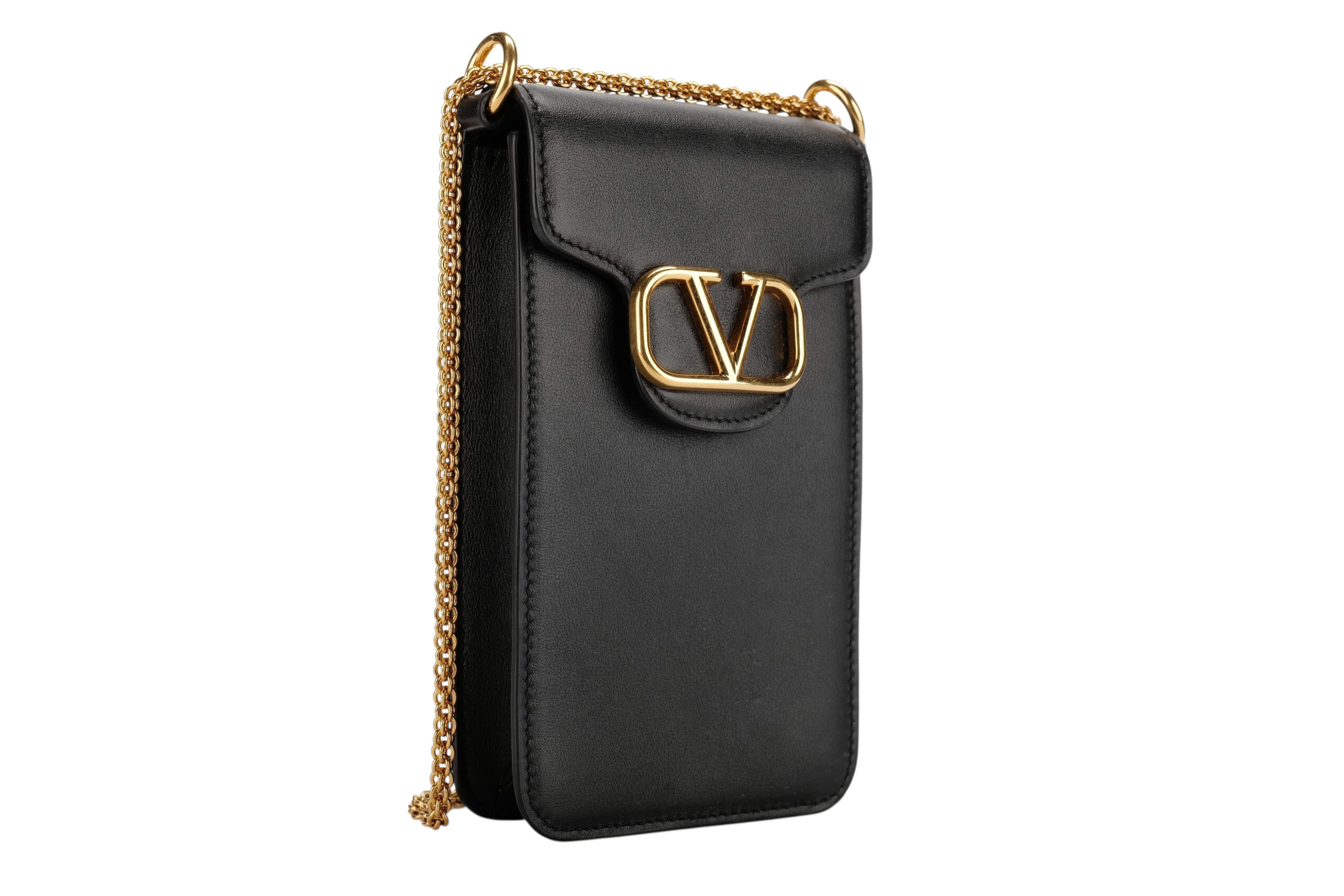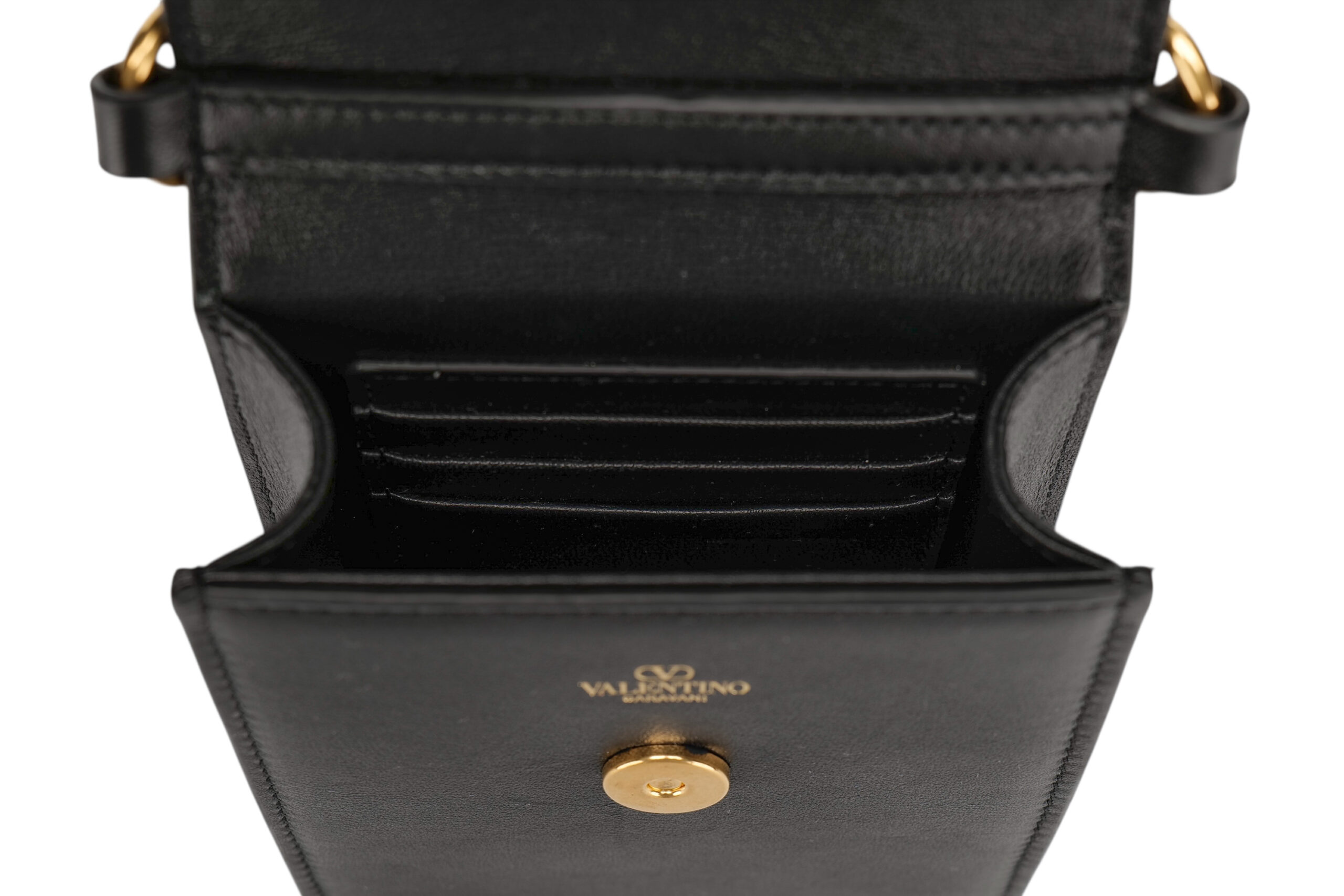 Valentino VLogo Crossbody Phone Case Black Leather Chain, Gold Hardware