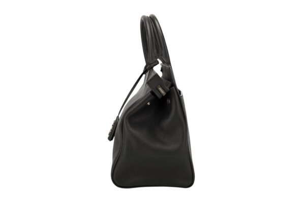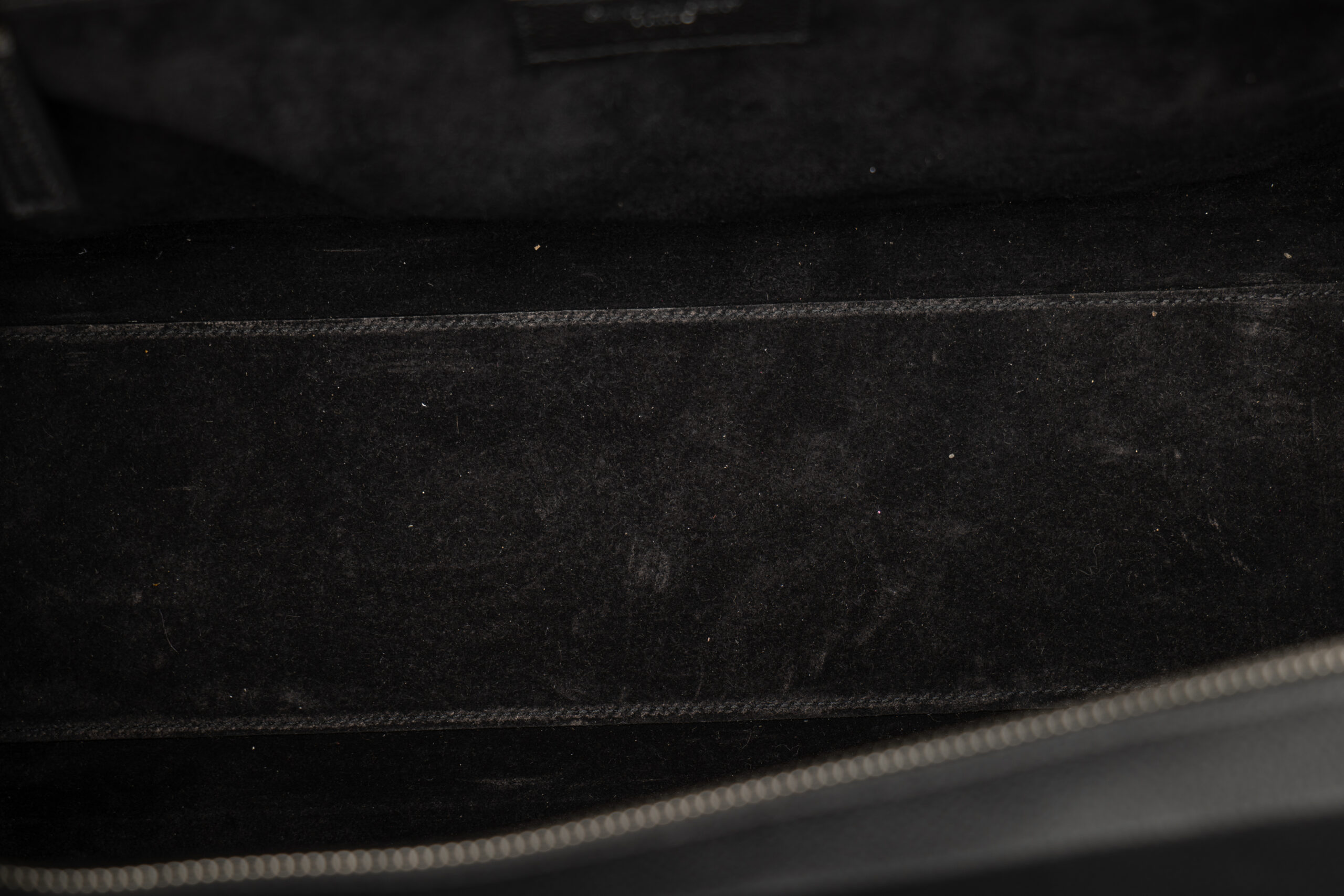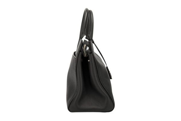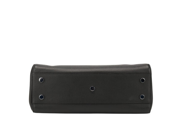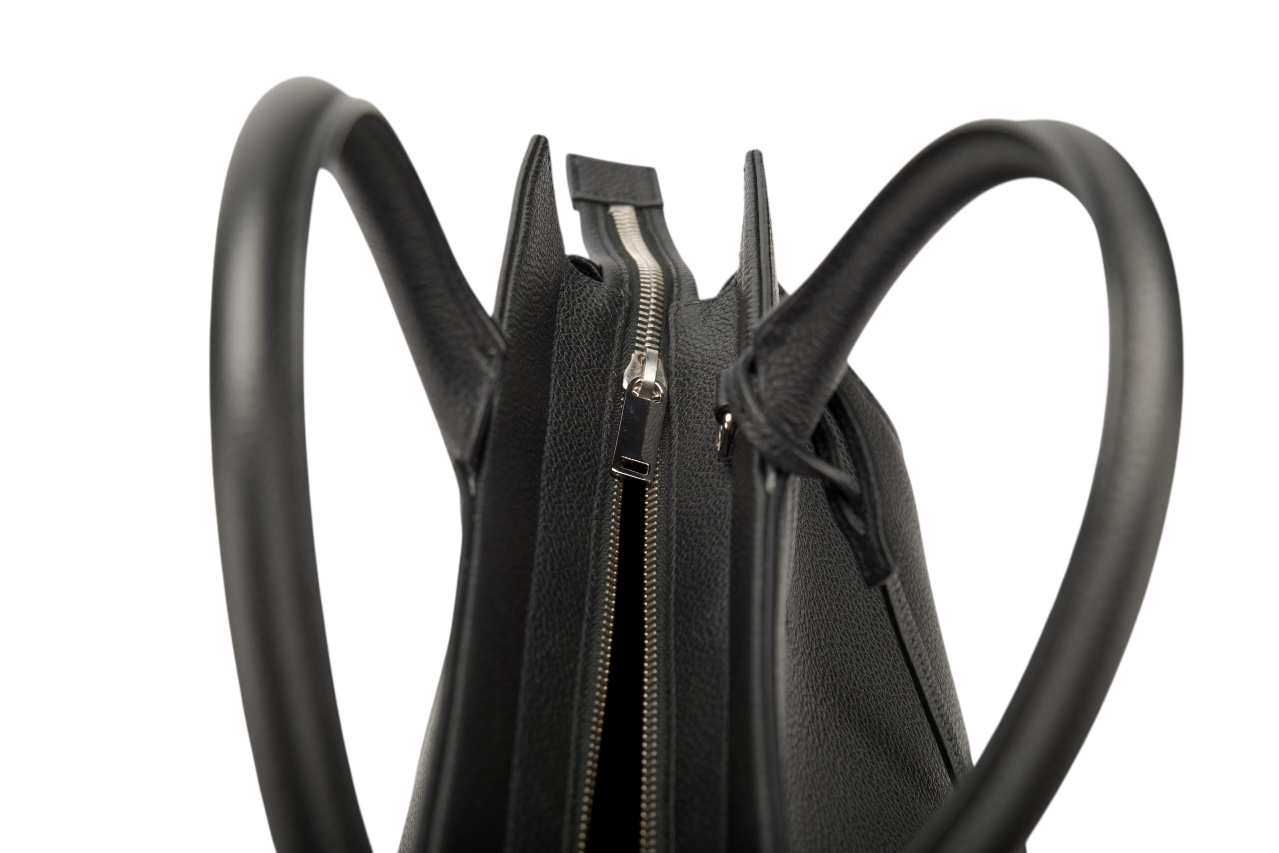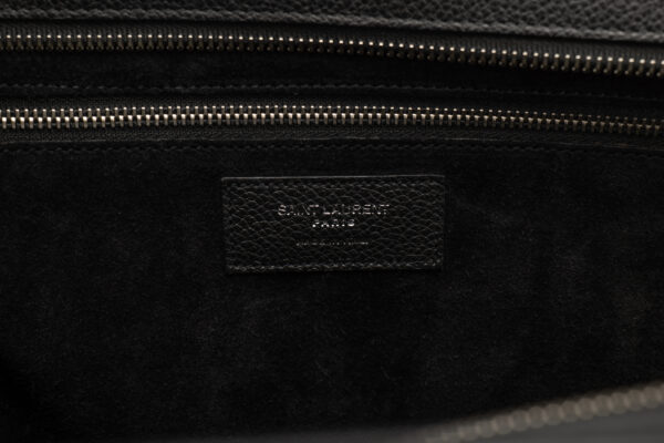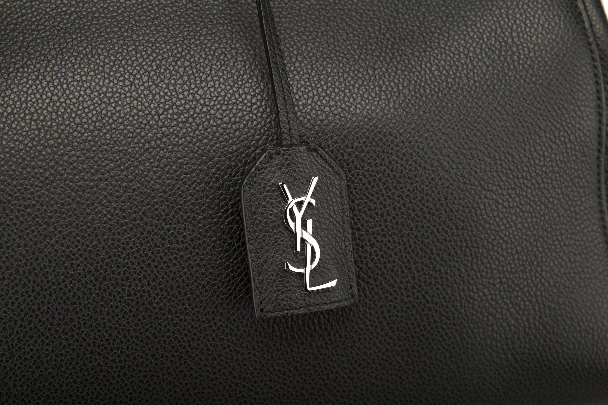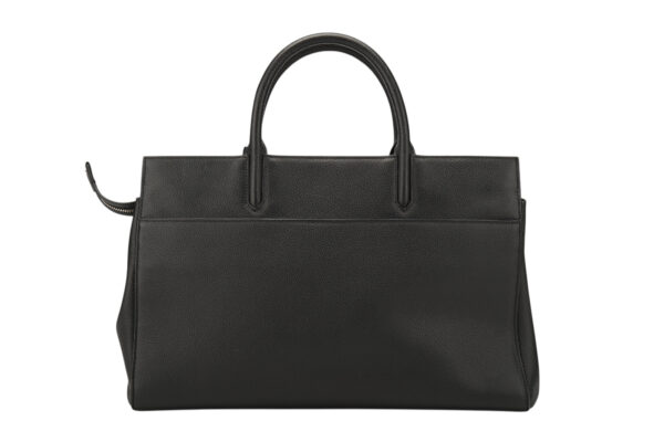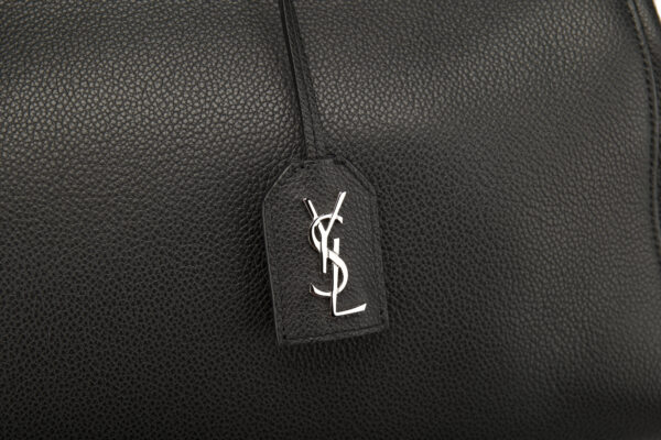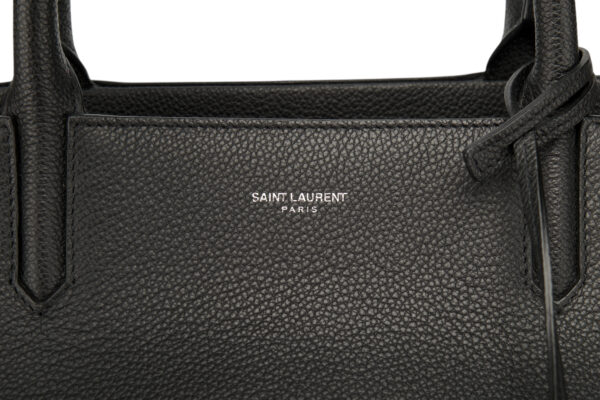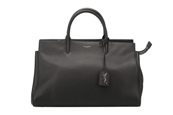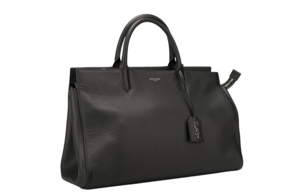 The Saint Laurent Cabas Rive Gauche in black grained leather epitomizes the house’s refined Parisian aesthetic — elegant, structured, and effortlessly modern. Crafted in Italy from luxuriously textured leather, this bag showcases a sleek silhouette punctuated by minimal branding, with the subtle Saint Laurent Paris logo in silver at the center and the signature interlocking YSL charm accenting the leather-encased key holder. The bag’s refined construction features a two-way top zipper, ensuring security while maintaining a streamlined look, and dual rolled handles for a polished, professional carry. True to the brand’s heritage, the Cabas Rive Gauche embodies the sophistication and bold restraint that have defined Saint Laurent since its inception, making it a wardrobe essential for those who appreciate understated luxury. A perfect fusion of timeless craftsmanship and contemporary allure, this bag is a statement in quiet confidence — the kind of piece you’ll reach for season after season.